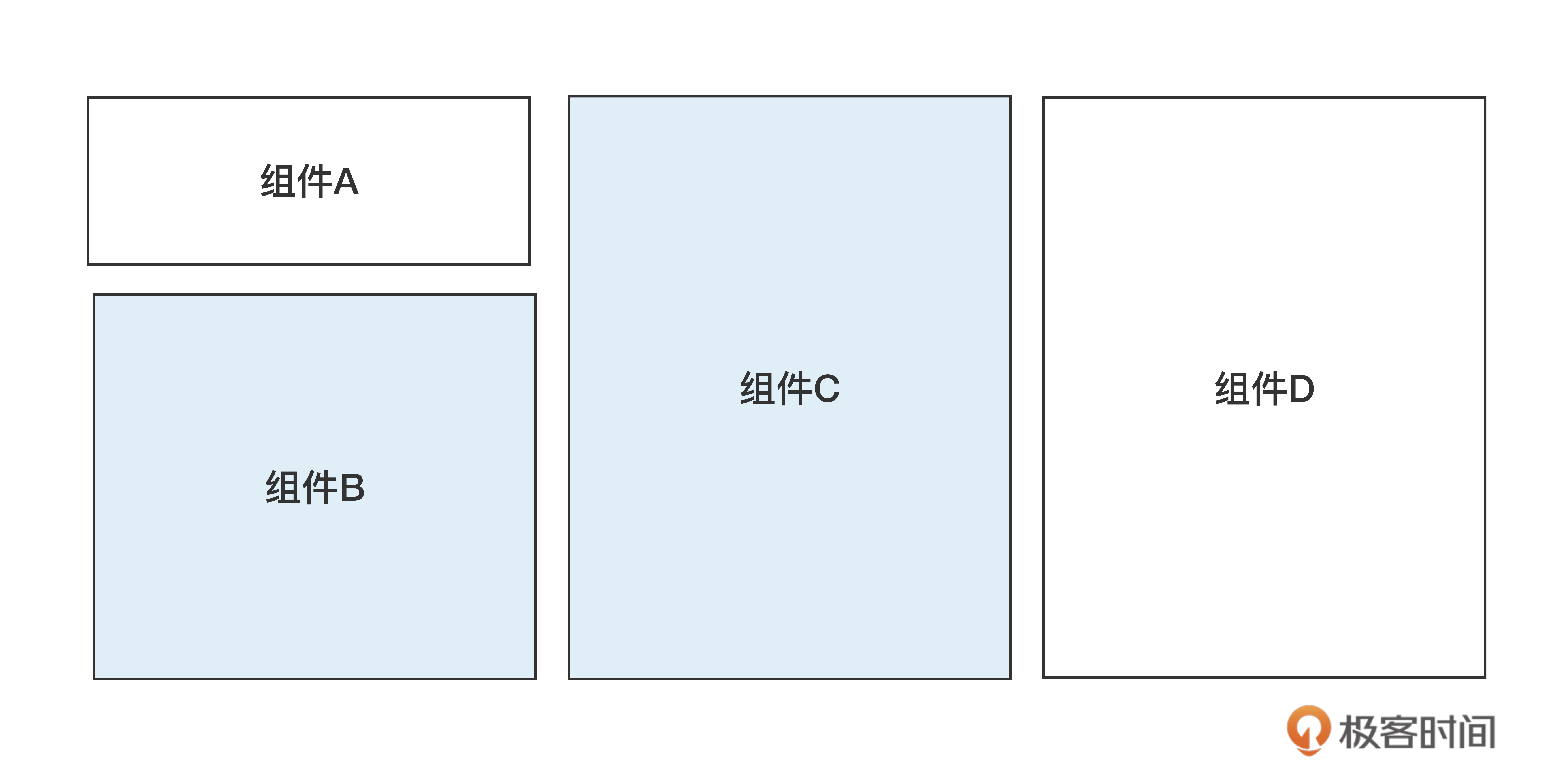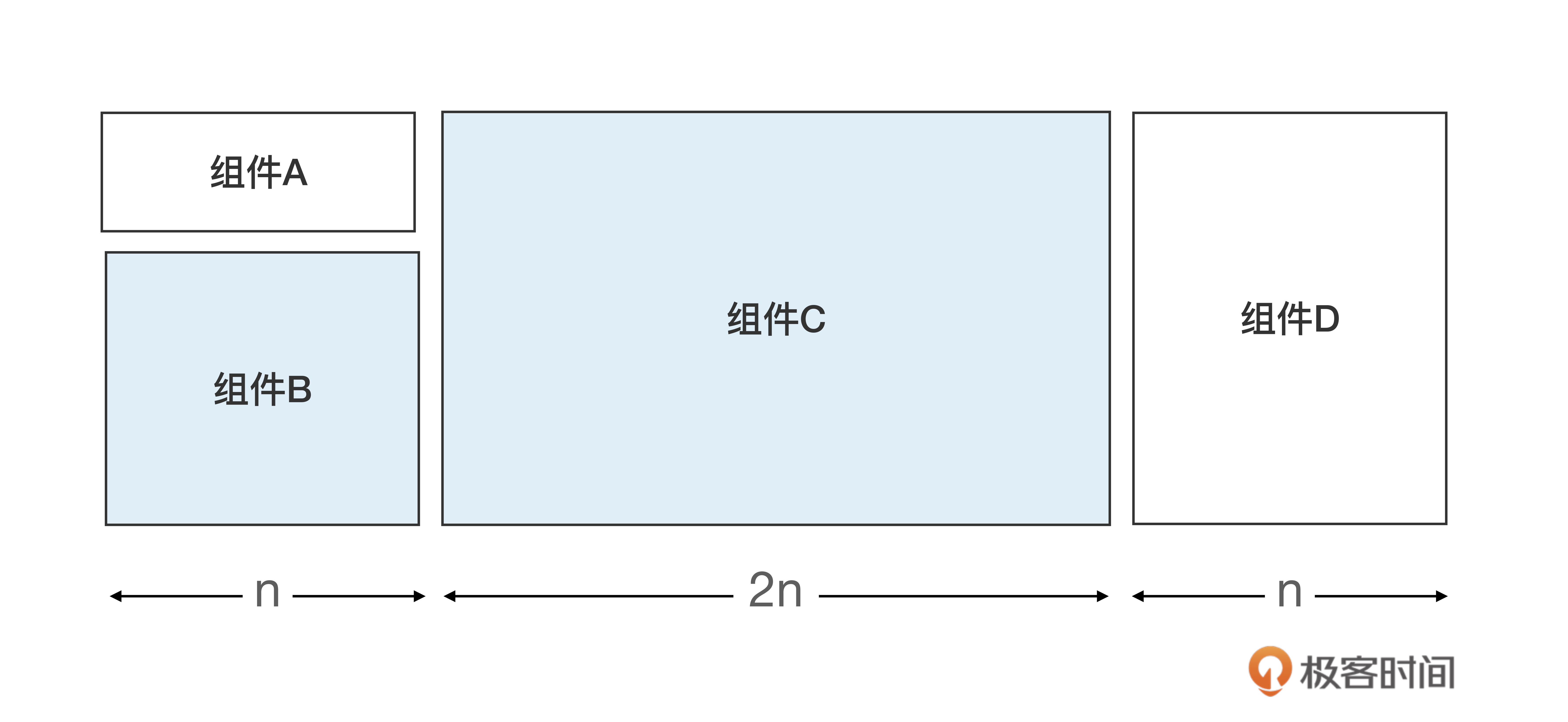 首先用第二节的切蛋糕法将这4个组件分组,显然是得到左中右三列。然后再根据尺寸分配优先原则,组件A和D的优先级是最高的,因为它们没有弹性。组件B和组件C的优先级谁高谁低呢?还是一样高呢?
