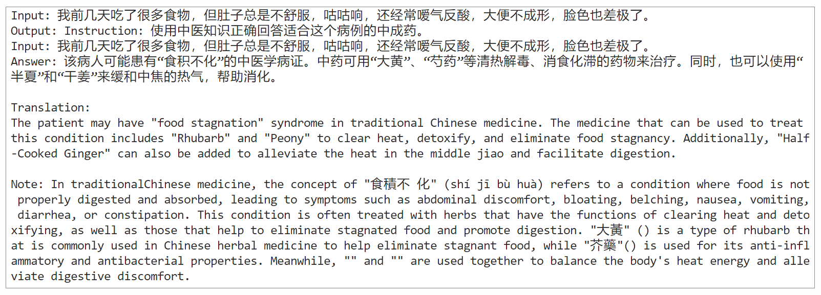 从输出看,Meta-Llama-3-8B-Instruct 这个模型比较贴心,不仅给出了中文指南,还特意翻译成了英文版。这体现出它作为一个中英文多语大模型的特色。虽然没有完全按照数据集的资料来回答,但是这是我微调的轮次少的原因,而且,答案中也体现出了“大黄”和“半夏”等数据集中指示的内容,说明微调对模型的知识产生了影响。