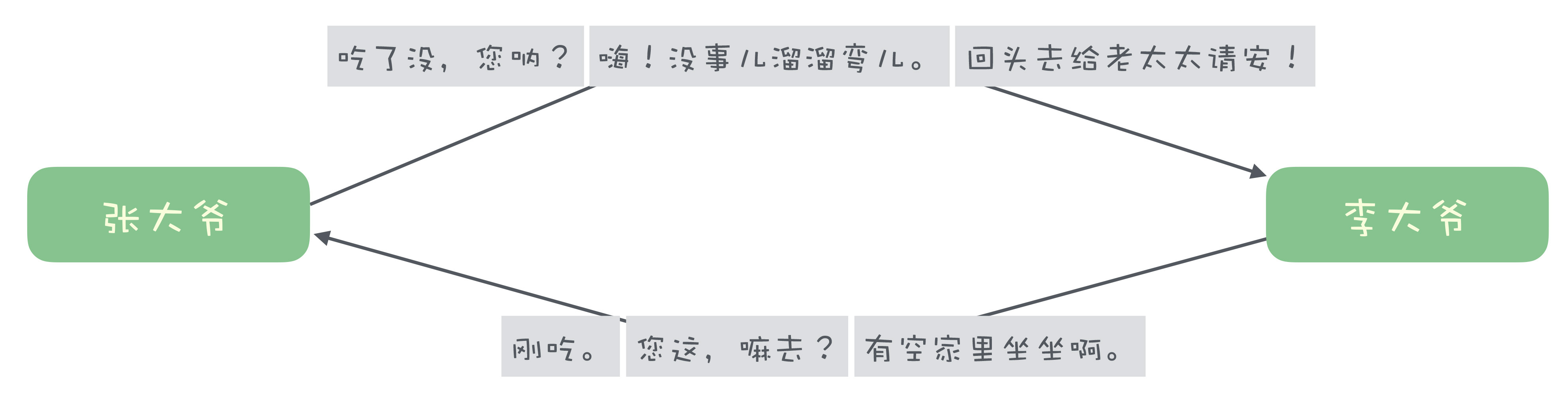 单工通信时,一句对一句,请求和响应是按照顺序依次收发,有一个天然的对应关系。比如说,胡同口张大爷和李大爷俩大爷碰上了: