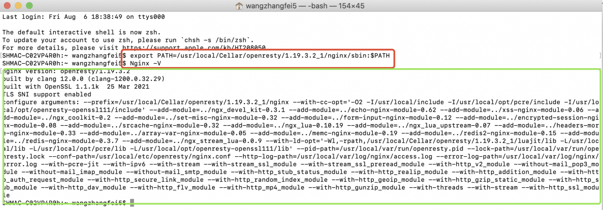 安装完成之后,默认的安装位置在 /usr/local/Cellar/openresty/1.19.3.2_1,这时我们设置下环境变量(即告诉终端输入的命令去哪里找)。