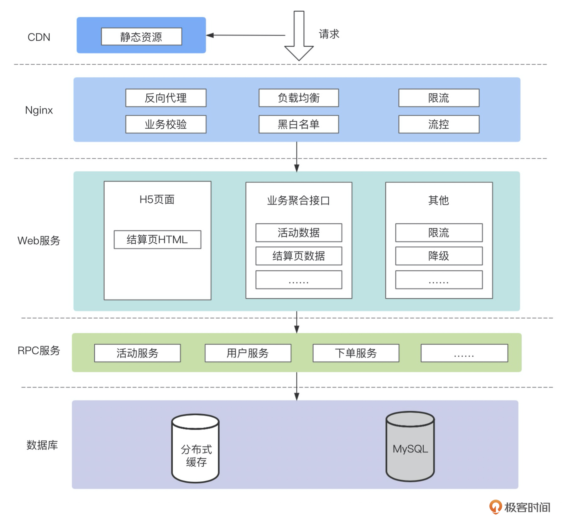 我们从最基础的讲起。如果Web服务既提供H5页面、静态资源,同时也提供业务接口,这就意味着所有的请求使用的都是同一个域名,在活动刚开始时,大家都点击抢购按钮进结算页,而结算页页面拉取静态资源,会占用很多带宽资源。
