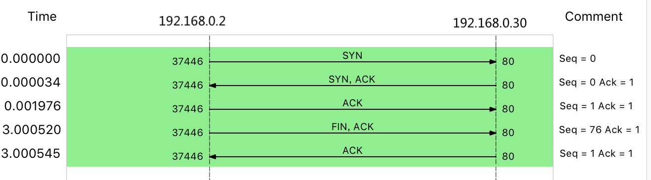 我把这一过程,用 TCP 交互的流程图(实际上来自 Wireshark 的 Flow Graph)来表示,你可以更清楚地看到上面这个问题: