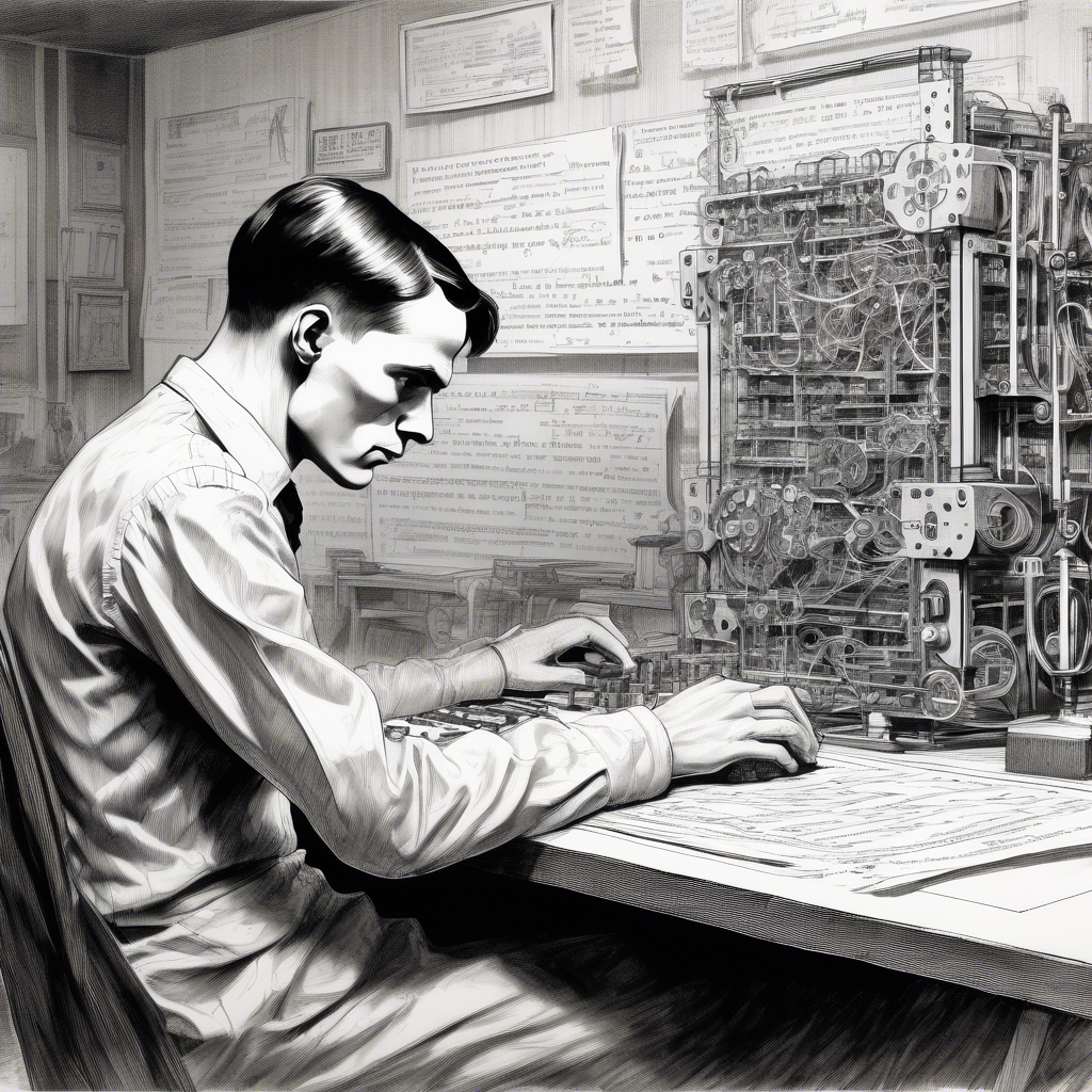 1 The black and white sketch depicts a young Alan Turing working attentively. He is sitting at a table with a model of the Turing machine in front of him, consisting of a long paper tape and a read/write head. Turing is holding his chin in one hand, with a focused and deep gaze, as if contemplating the mysteries of computation. The table and paper tape are covered with densely written mathematical symbols and formulas. The background is adorned with simple lines, highlighting Turing's focused expression and profound thoughts.