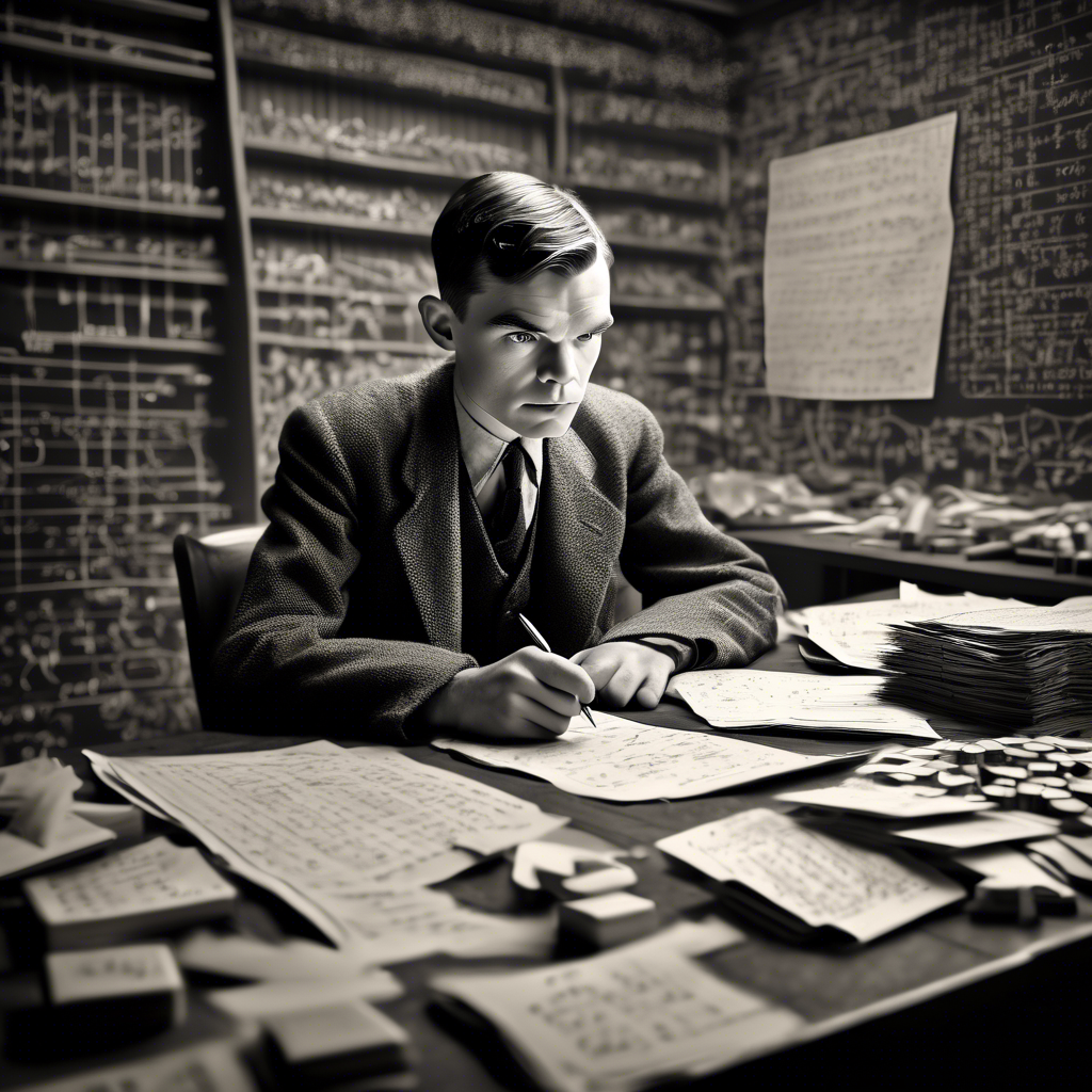 黑白照片效果,年轻的艾伦·图灵正在专注地工作。他坐在办公桌前,桌上放着一台正在运行的早期计算机原型机,机器的电子管正在闪烁。图灵拿着一张写满复杂数学符号和流程图的纸,似乎在设计算法。他的目光睿智而专注,完全沉浸在对计算机科学的探索中。