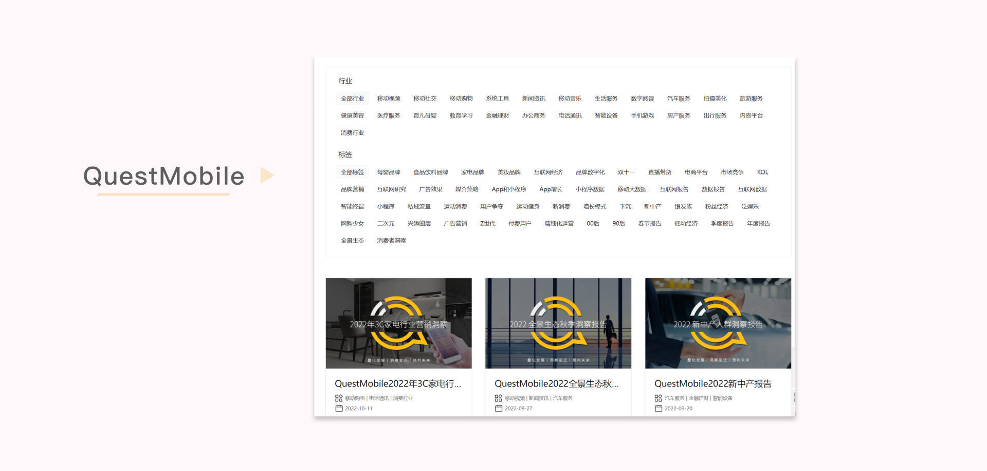 再说行业信息文档。我通常从三部分获取,一部分是刚刚提到的行业数据平台QuestMobile,定期会有各行业的数据资料,当然最好的还是购买QM的数据服务,全行业数据精准度非常高。