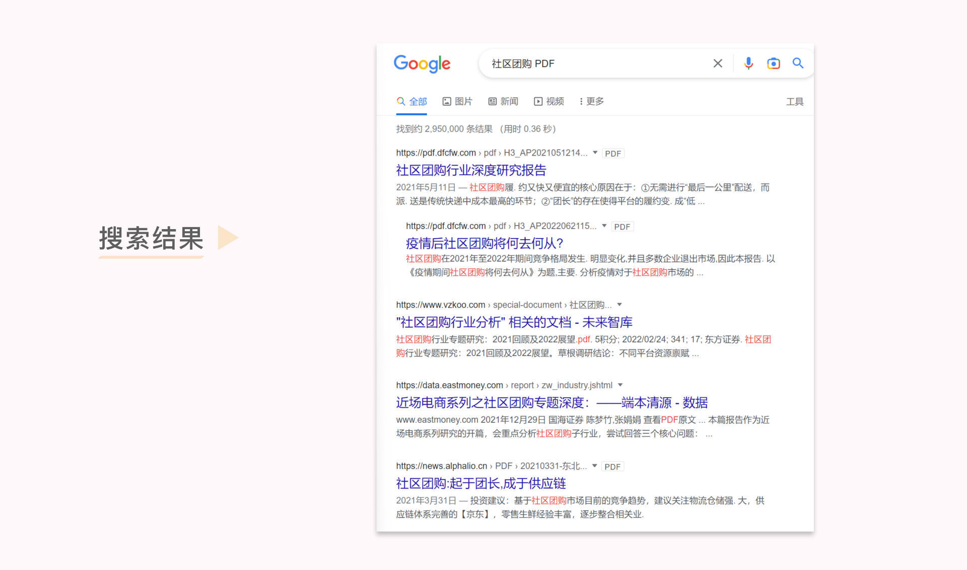 当然,还有一些免费来源,相对比较杂,有些是直接进入各大券商官网查,有些则来自一些小网站。这里有一个小技巧:善用Google。比如我们要找社区团购的研报,完全可以直接搜索: