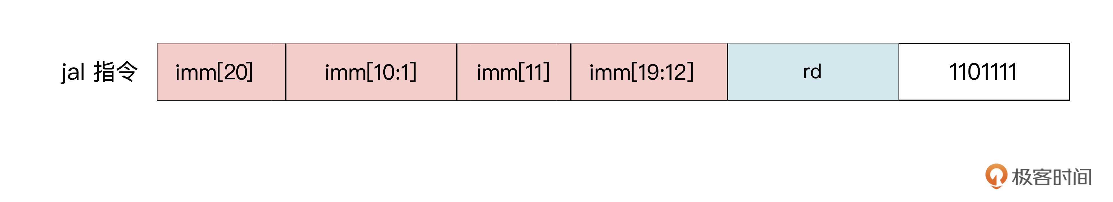 同样地,无条件跳转指令也用这种方式进行预处理。如下图的jal跳转指令的格式,它的操作码为7’b1101111。