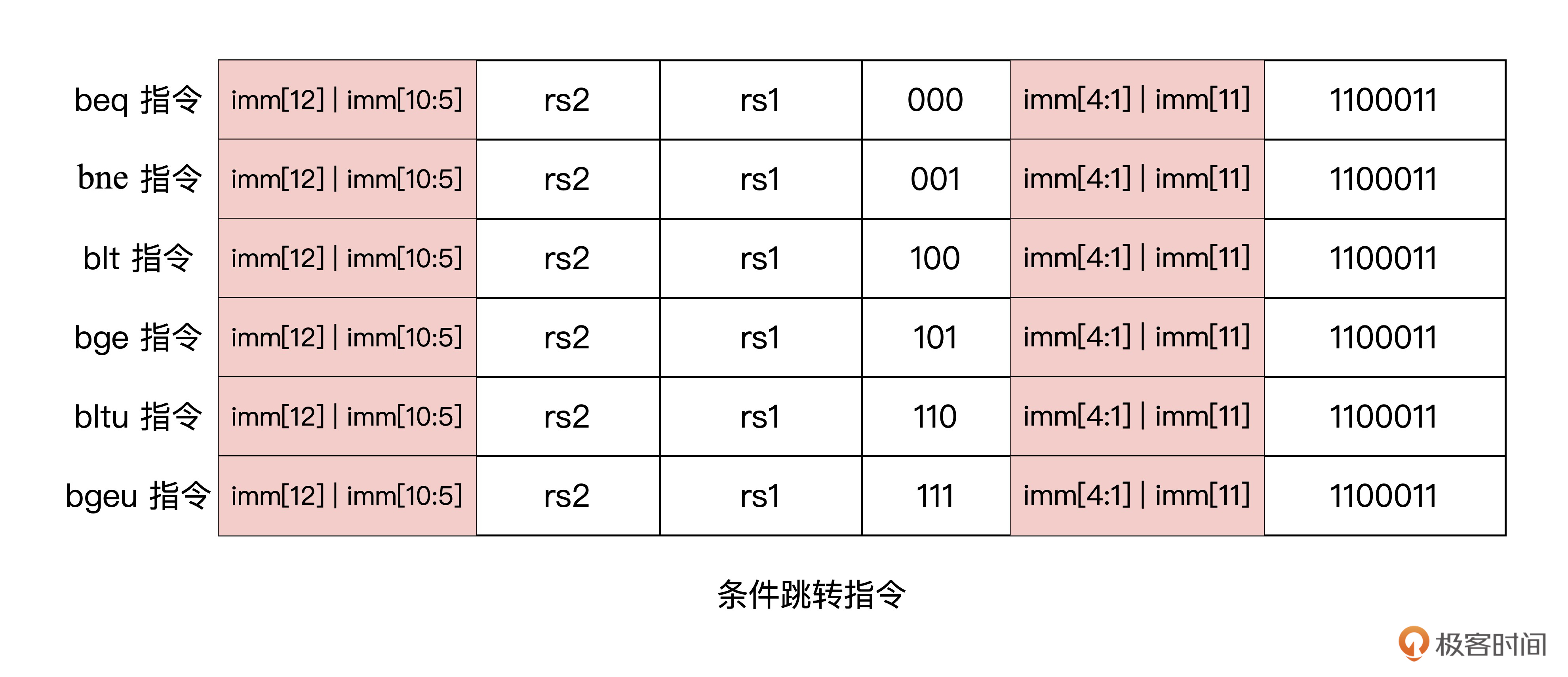 从这张表格我们可以发现,条件跳转指令的操作码,也就是指令中的低7位数都是 7’b1100011。根据这一特点,我们就可以在指令解码之前,判断出接下来可能会发生跳转。