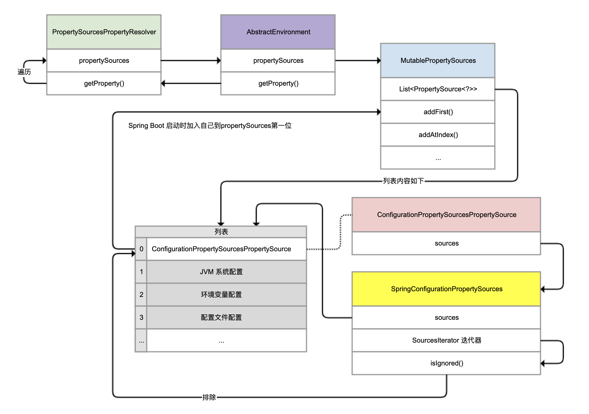 调试可以发现,这个循环遍历(getSource()的结果)的配置源,其实是SpringConfigurationPropertySources(图中黄色类),其中包含的配置源列表就是之前看到的9个配置源,而第一个就是ConfigurationPropertySourcesPropertySource。看到这里,我们的第一感觉是会不会产生死循环,它在遍历的时候怎么排除自己呢?