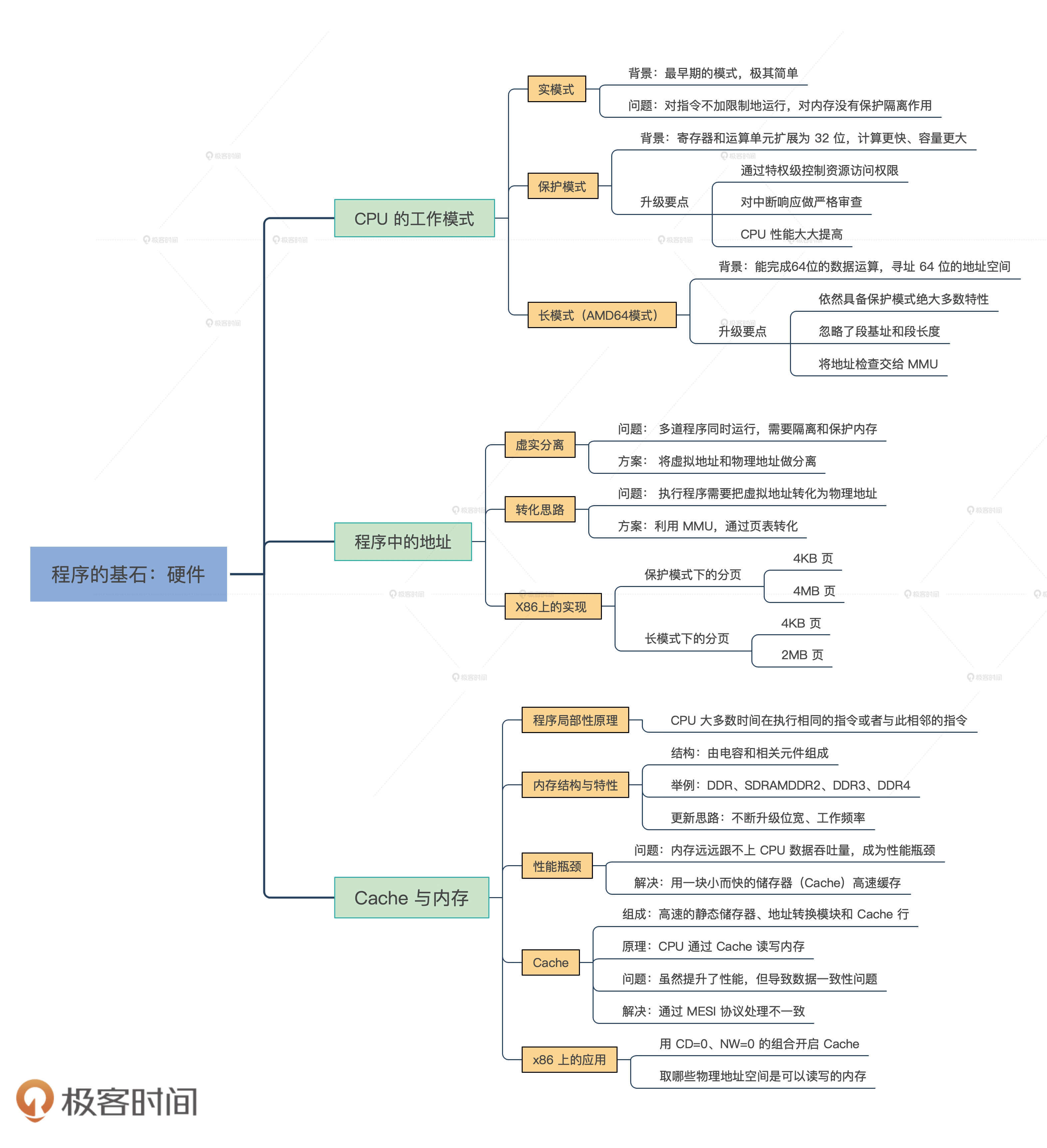 因为这节课也是我们硬件模块的最后一节,可以说没有硬件平台知识,写操作系统就如同空中建楼,通过这个部分的学习,就算是为写操作系统打好了地基。为了让你更系统地认识这个模块,我给你整理了这三节课的知识导图。