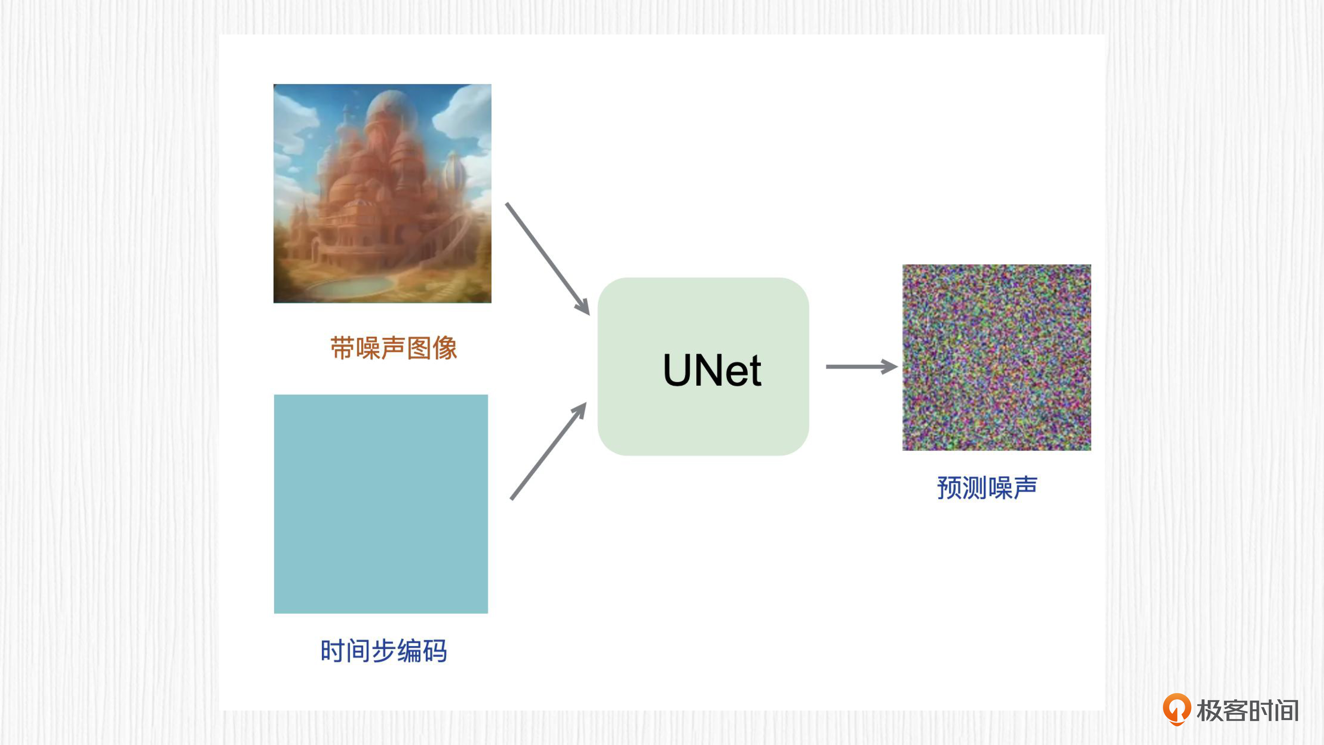 先看第一层含义,如何根据加噪结果和时间步t预测噪声呢?这里深度学习模型就能派上用场了!我们希望得到这样一个模型,输入第t步加噪结果和时间步t,预测从第t-1步到第t步噪声值。