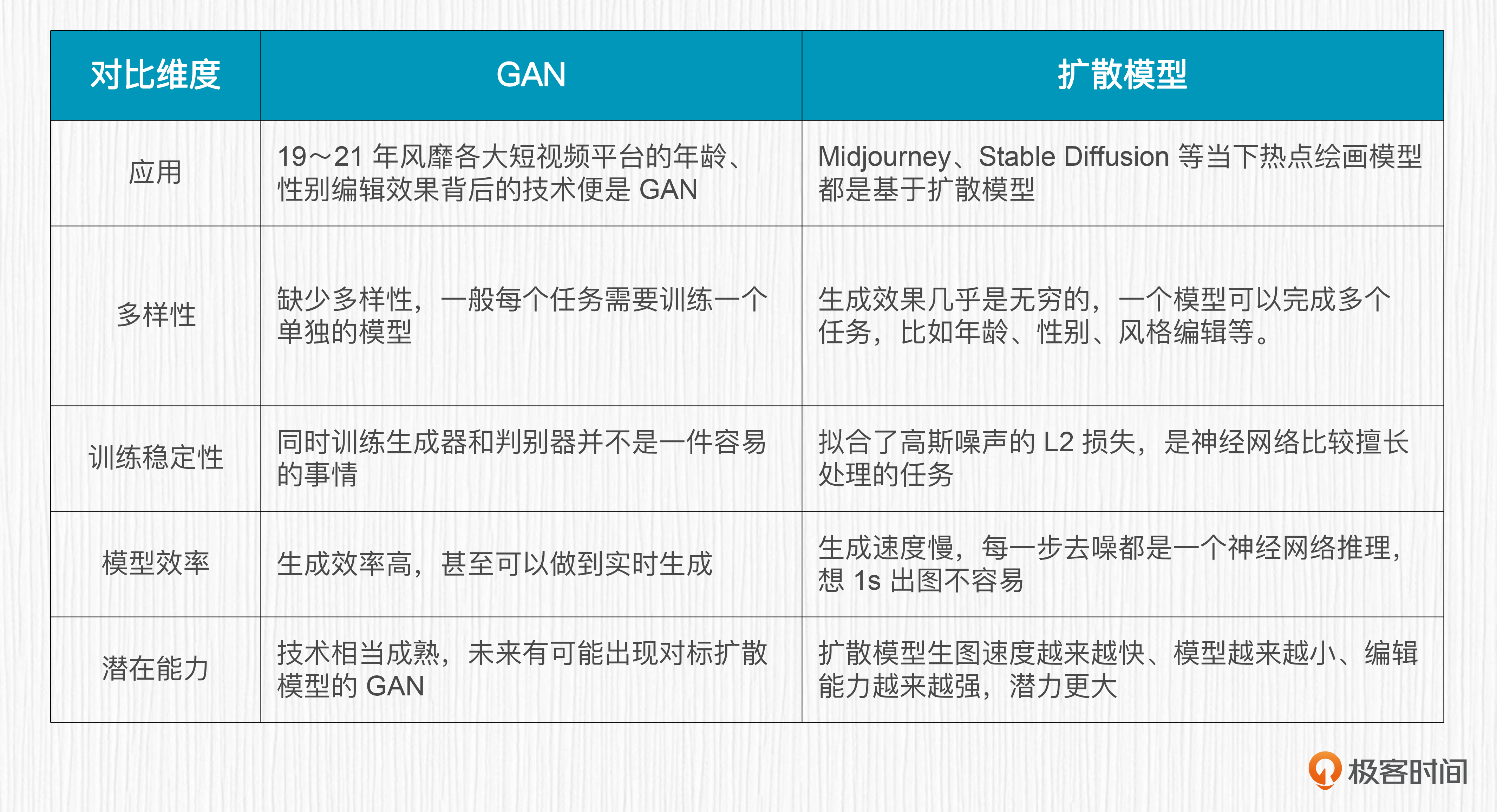 通过对比的方式进行学习有助于我们加深理解,整合知识。所以我们这就来从多个维度,对比一下GAN和扩散模型的特点,你可以参考后面的表格。