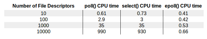 从图中可以明显地看到,epoll的性能是最好的,即使在多达10000个文件描述的情况下,其性能的下降和有10个文件描述符的情况相比,差别也不是很大。而随着文件描述符的增大,常规的select和poll方法性能逐渐变得很差。