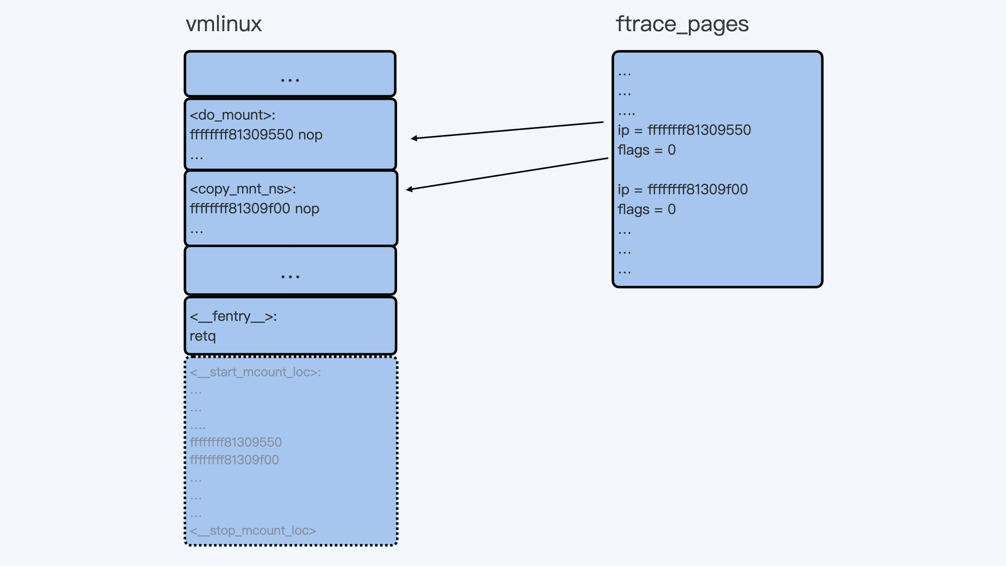 而”-mrecord-mcount”参数在最后的内核二进制文件vmlinux中附加了一个mcount_loc的段,这个段里记录了所有”callq <fentry>”指令的地址。这样我们很容易就能找到每个函数的这个入口点。