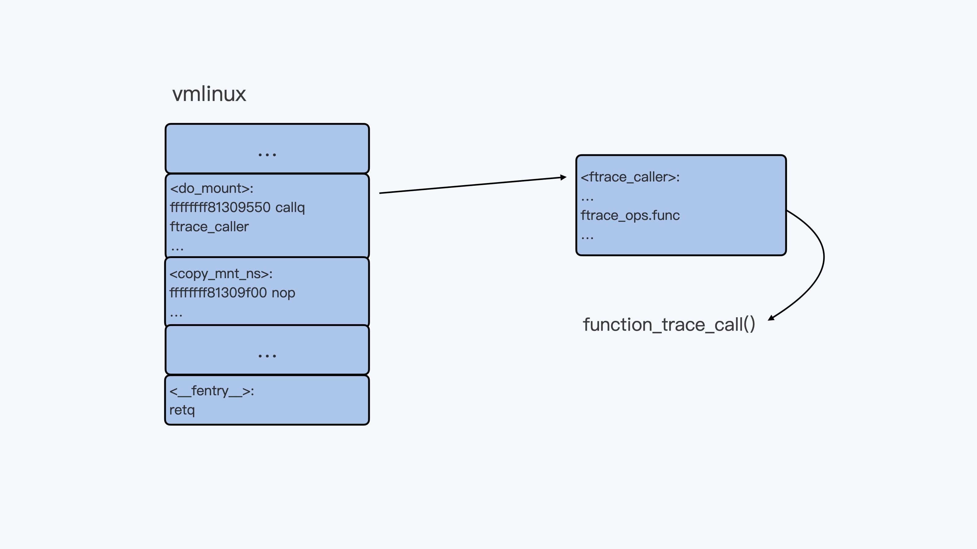 ftrace在内核启动的时候做了一件事,就是把内核每个函数里的第一条指令”callq <fentry>”(5个字节),替换成了”nop”指令(0F 1F 44 00 00),也就是一条空指令,表示什么都不做。