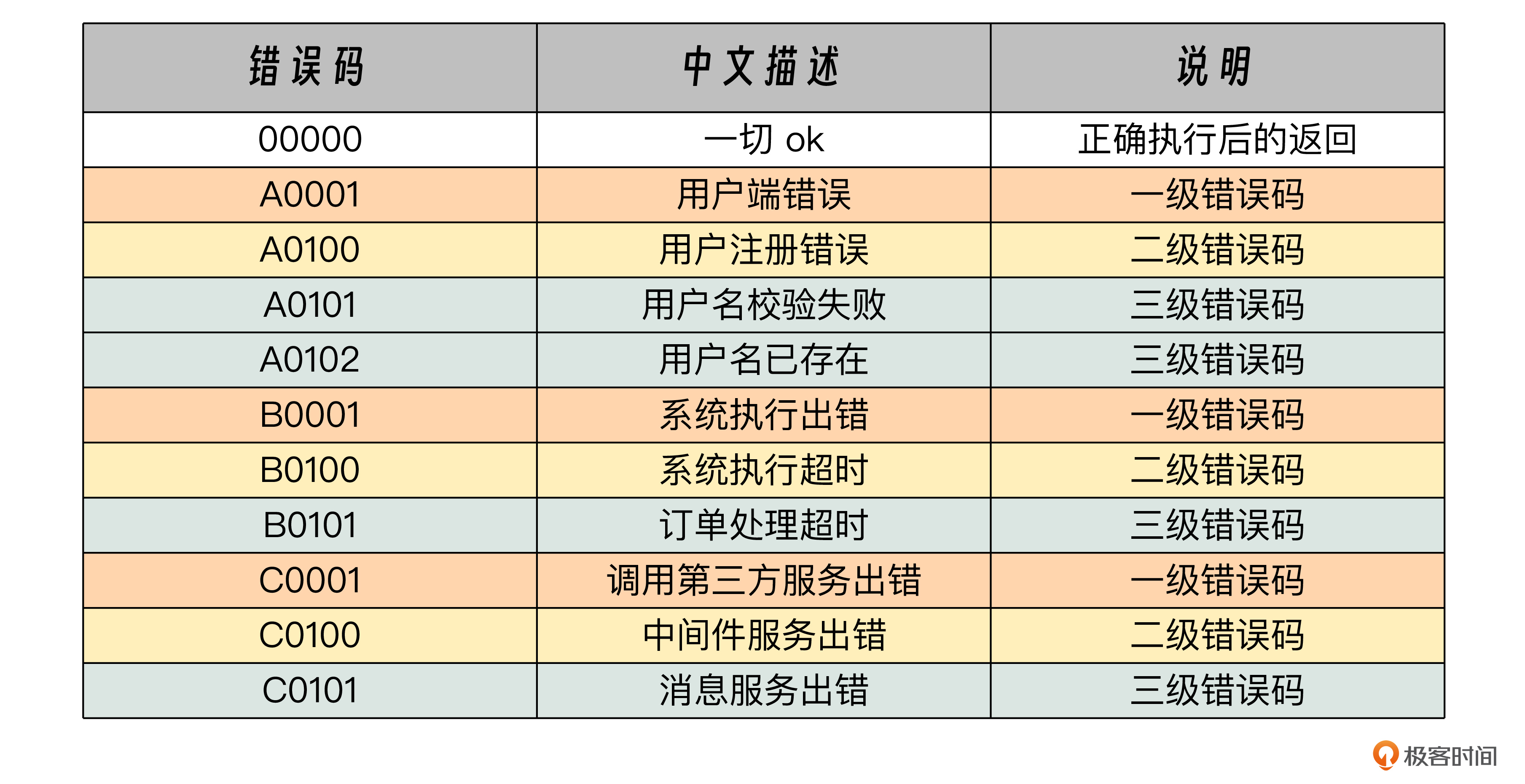 其中,错误来源用1位字母,表示一级错误。字母 A 表示错误来源于用户,比如参数错误,用户安装版本过低等问题;B 表示错误来源于当前系统,往往是业务逻辑出错,或程序健壮性差等问题;C 表示错误来源于第三方服务,比如RPC调用超时等问题。