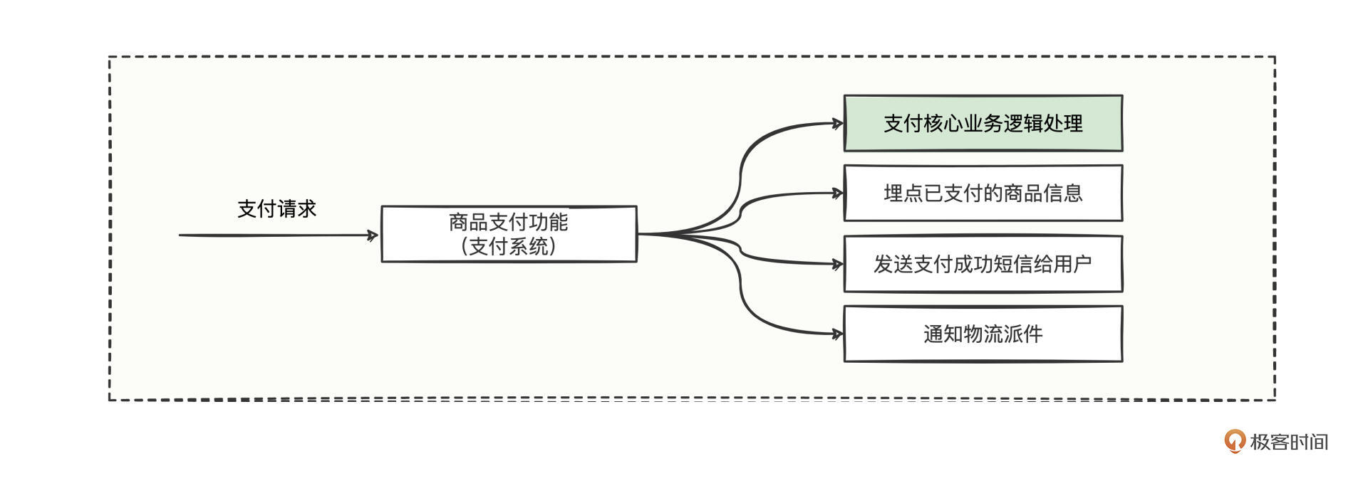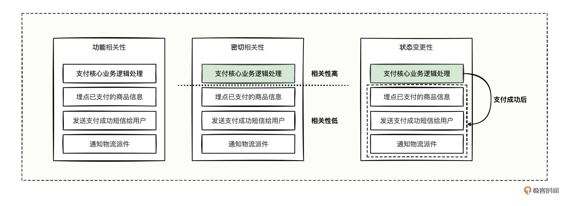 先看功能相关性,四个小功能的拆分没问题;再看密切相关性,支付核心业务逻辑是最重要的,其他三个事件的重要程度和迫切性并不高;最后看状态变更性,核心业务逻辑有了明显的状态变更后,在支付成功的关键节点后,驱动着继续做另外三件事。