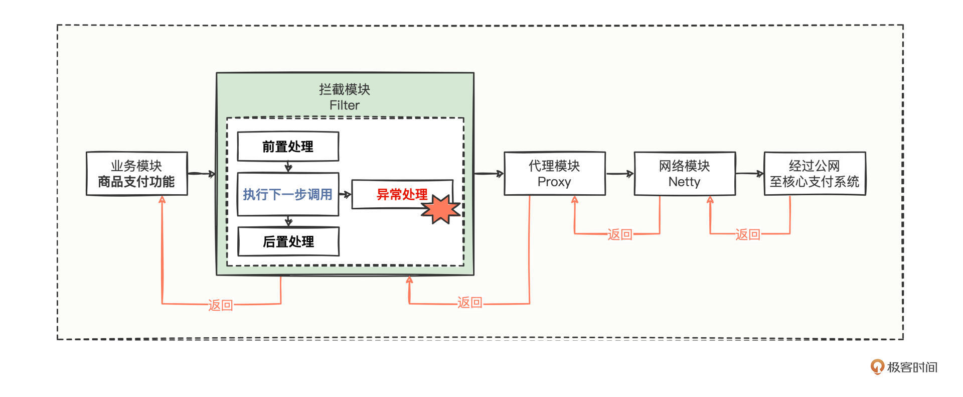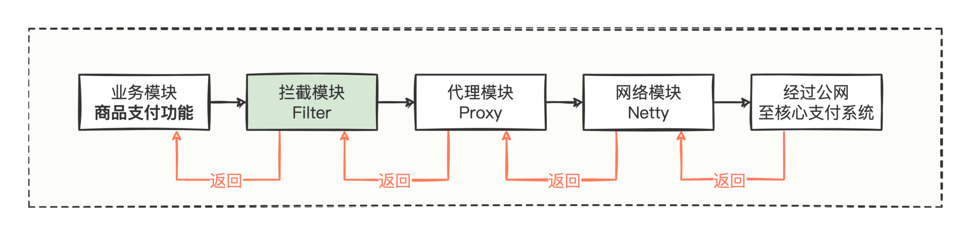 从商品支付功能的处理,到拦截模块,到代理模块,到网络模块,最后经过公网发送至核心支付系统。