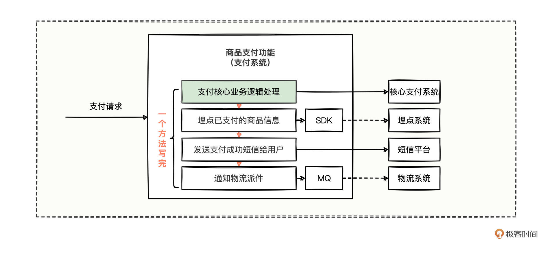 支付系统完成核心业务逻辑后,先调用埋点SDK进行支付商品埋点,然后调用短信平台发送短信,最后向MQ发送了一条物流派送消息。整个编码流程一气呵成。