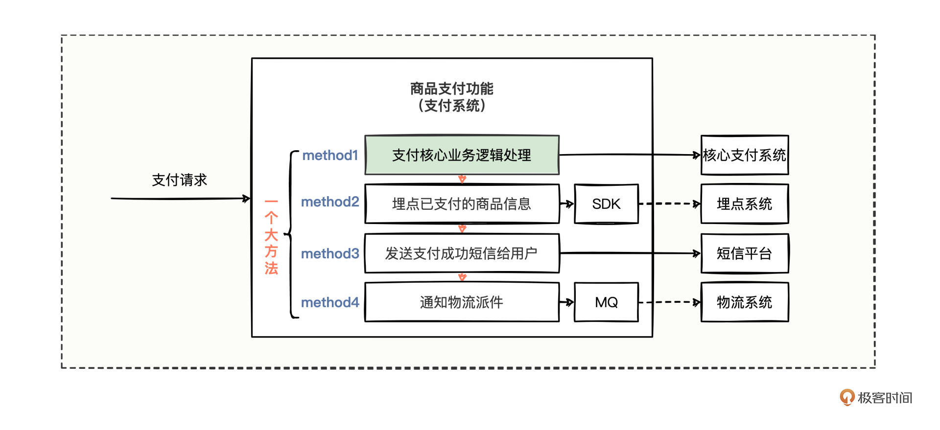 但停在这里,可能会为我们之后的繁重工作量埋下种子,比如一周后需求又来了,要发送邮件、通知结算,怎么办呢?是不是还得继续添加小方法5和小方法6?