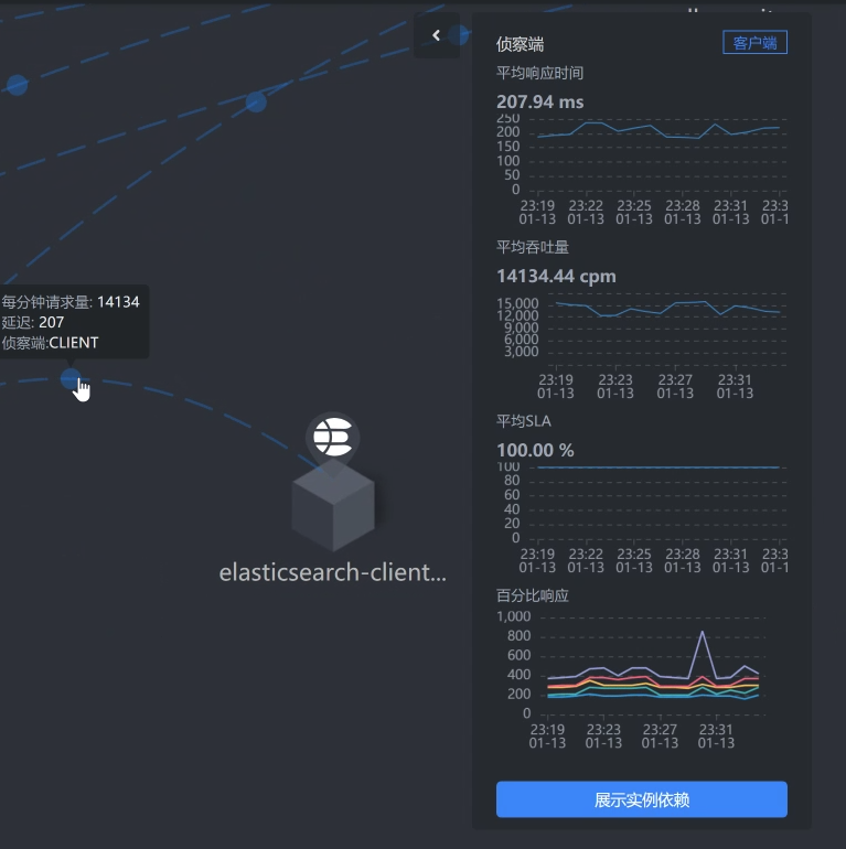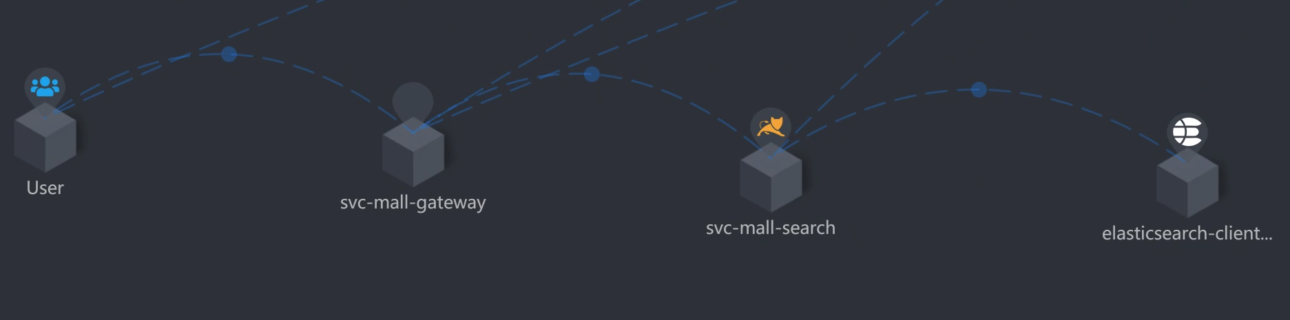 你看,从压力机到Gateway服务、到Search服务、再到ES-Client,这个APM工具也只能帮我们到这里了。因为我们用的是ElasticSearch 7来做的搜索服务的支撑,而这个skywalking工具也没有对应的Agent,所以后面并没有配置skywalking。
