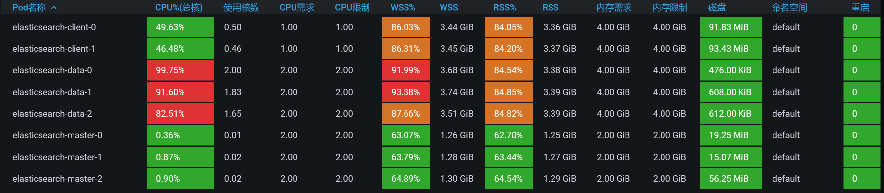 嗯,不错,ES data的POD把资源用起来了。其实这里要想继续调,还可以把CPU加大,ES本来就是吃CPU、内存的大户。不过,我们前面在配置的时候,给ES data的CPU也确实太小了。这个问题,并不是我故意设计出来的,而是当时在部署的时候,没考虑到这些。