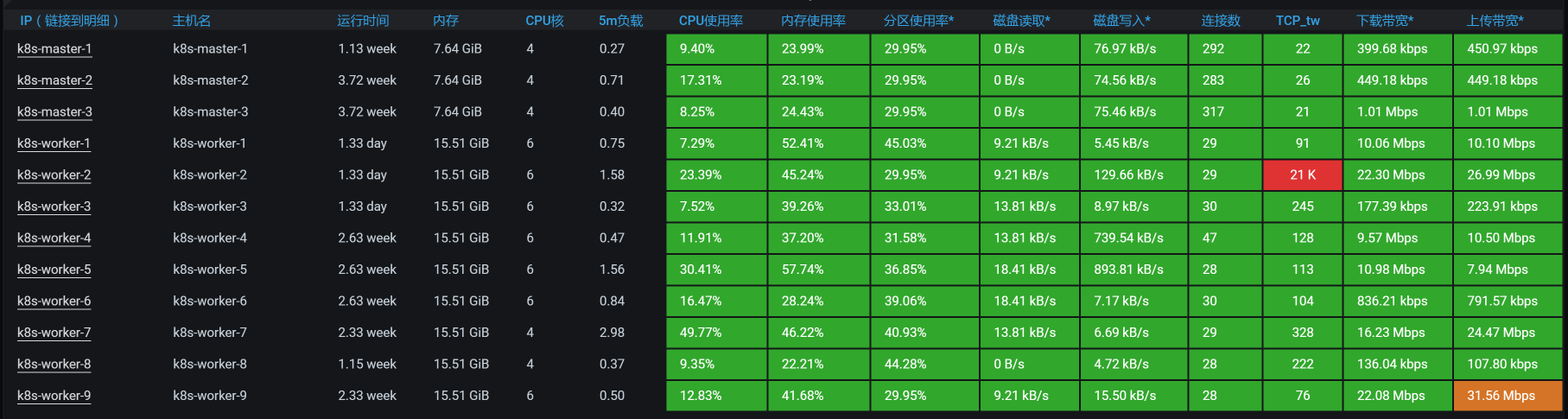 回到我们这个例子中,从下面的k8s worker(也就是k8s中的node,在我们的环境中我习惯叫成worker,就是为了体现:在我的地盘,我爱叫啥就叫啥)的数据上来看,似乎没有一个worker的资源使用率是特别高的。