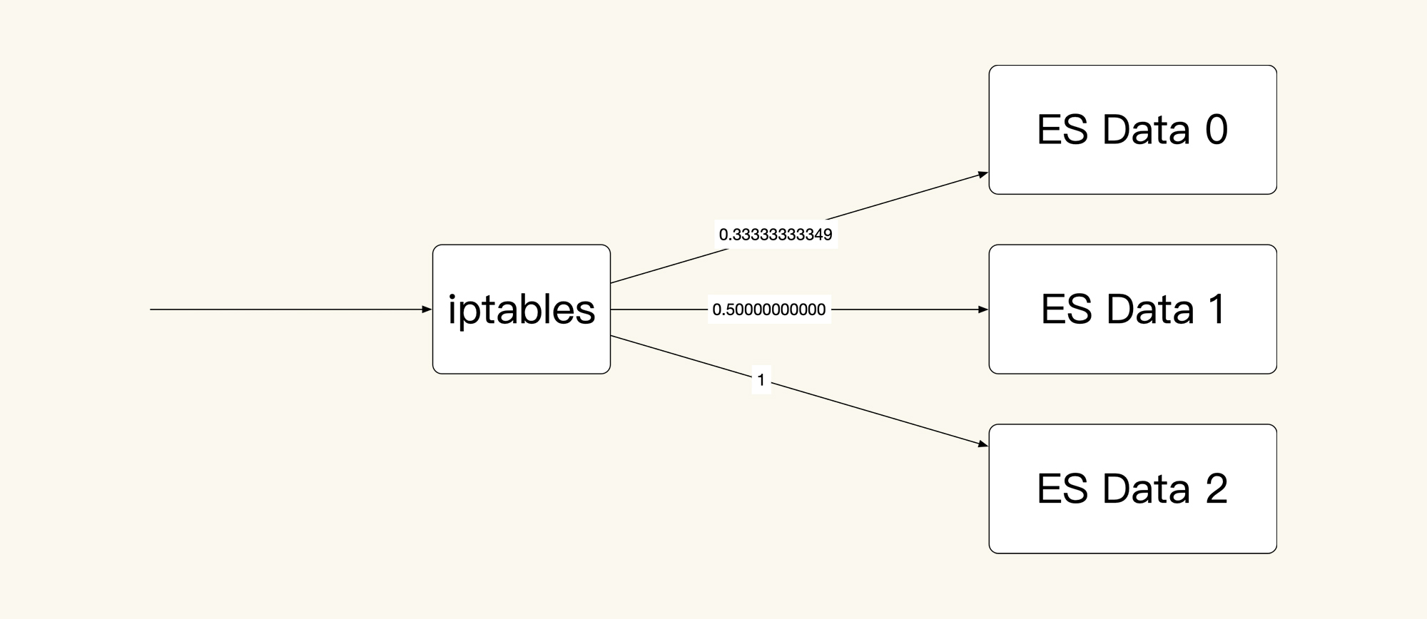 我们假设有30个请求进来,那ES Data 0上就会有30x0.33333333349=10个请求;对于剩下的20个请求,在ES Data 1上就会有20x0.50000000000=10个请求;而最后剩下的10个请求,自然就到了ES Data 2上。这是一个非常均衡的逻辑,只是在iptables规则中,我看着这几个数据比例,实在是觉得别扭。