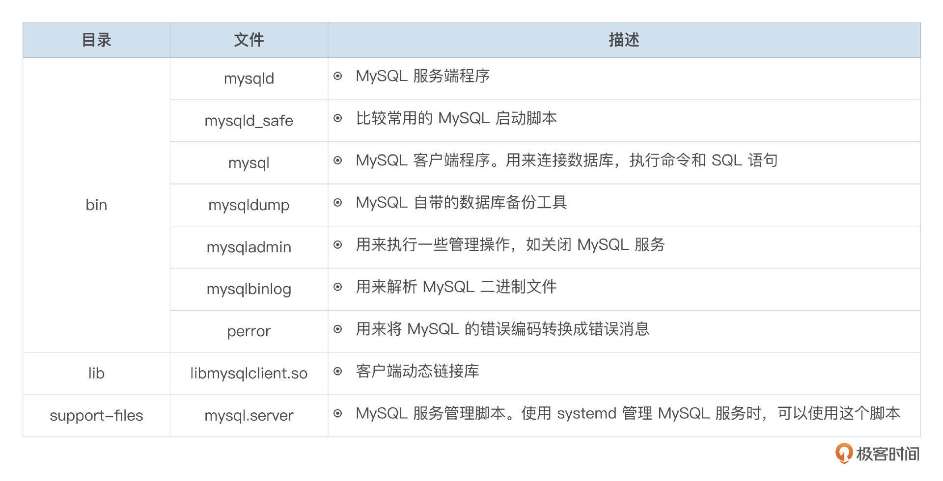 bin目录下包含MySQL的服务端和客户端,以及一些命令行工具。lib目录中有MySQL客户端库,使用C API访问MySQL数据库时,需要用到这里面的库文件。lib目录下还有一个plugin目录,存放着MySQL的各类插件,包括我们在后续课程中会介绍的CLONE插件、半同步插件、组复制(MGR)插件。include目录下是C API的头文件,编译访问MySQL的C代码时会用到这些文件。share目录下有一些运行MySQL需要用到的文件,如不同语言的错误日志信息文件、字符集的定义文件。