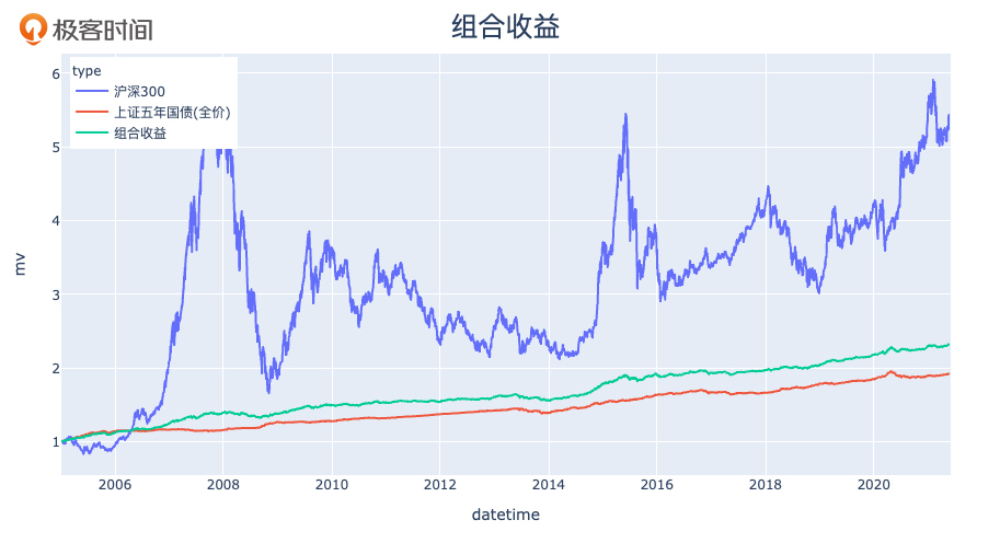 代表股票资产的沪深300指数,长期波动率大致是20%;代表债券资产的上证5年国债指数,波动率大致是2%。它们波动率的倒数比值大致是1:10,这样就得出了我们构建组合的权重。