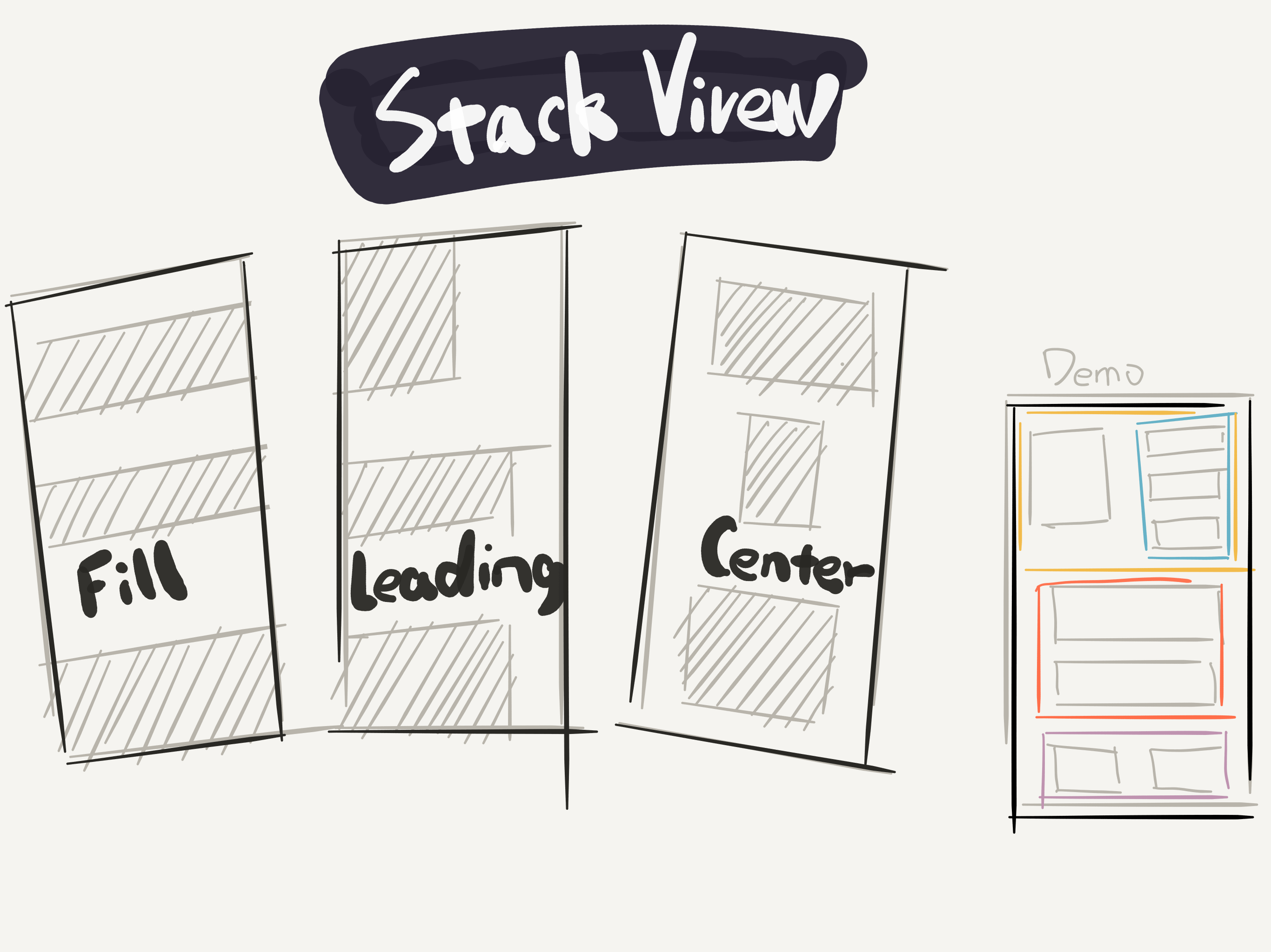 UIStackView 会在父视图里设置子视图的排列方式,比如 Fill、Leading、Center,而不用在每个子视图中都设置自己和兄弟视图的关系,如下图所示: