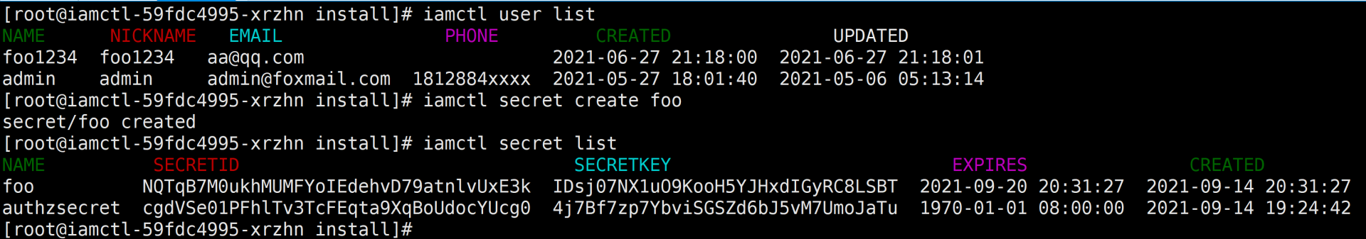 最后,我们可以登录iamctl容器,执行 test.sh iam::test::smoke 命令,来对IAM应用进行冒烟测试。