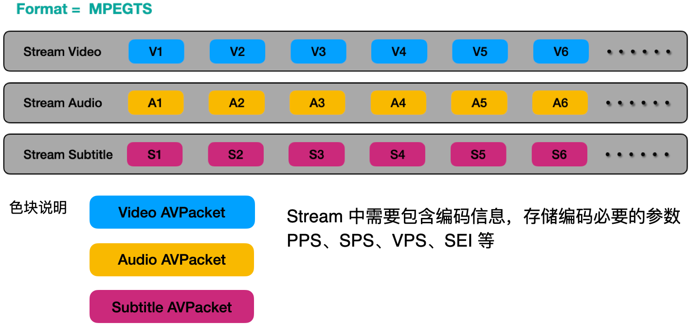 以MPEGTS封装为例,封装里面包含3个流,分别是视频流,音频流,字幕流,视频流中需要存储对应的视频编码参数信息,用来在解码器解码时使用,而视频、音频和字幕流在存储或者传输的时候是一一对应的,如果偏差太大的话会造成音视频不同步问题。