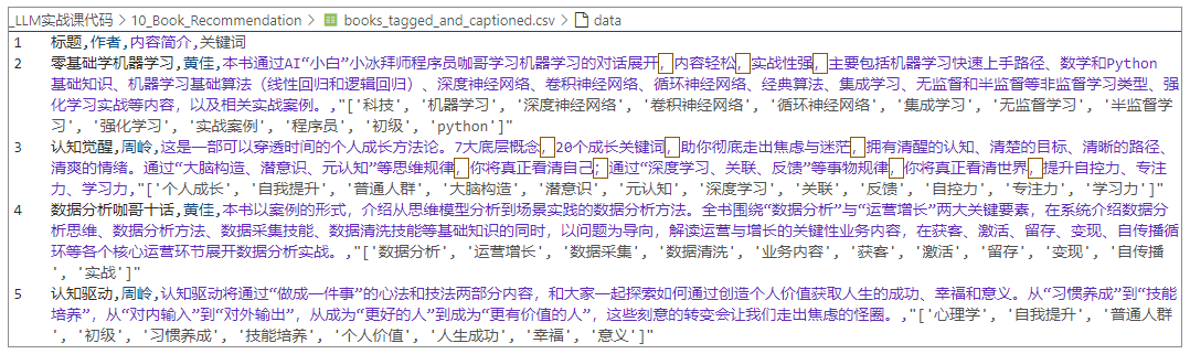 首先,我为你准备了一个非常简单的图书数据集。针对这个数据集,我们要构建一个基于大语言模型和向量嵌入的推荐系统。