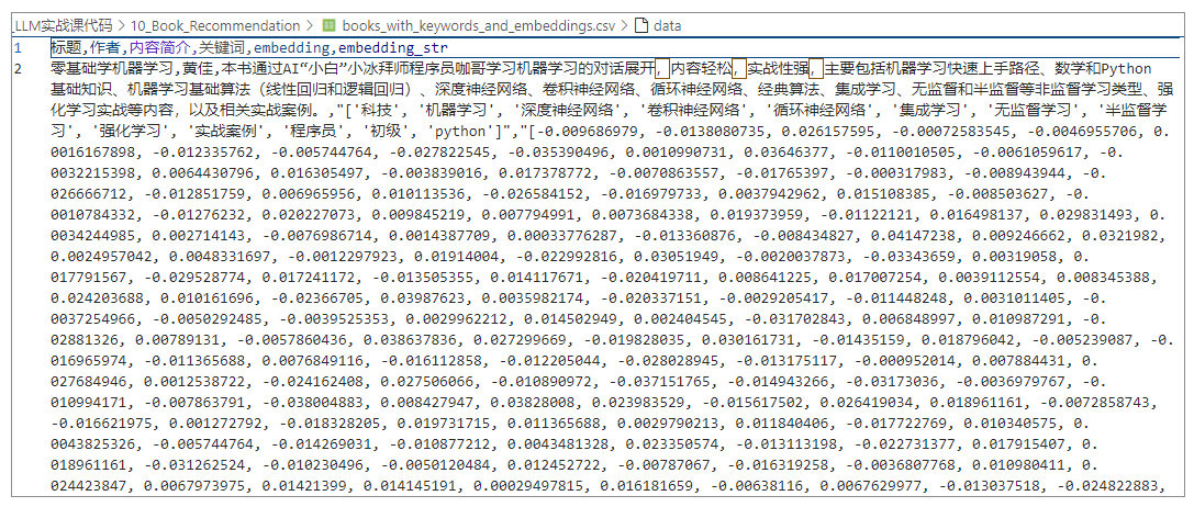 这里,我们对DataFrame的每一行应用get_embedding函数,为每本书生成嵌入向量,将嵌入向量转换为字符串以便保存,并将带有关键词和嵌入向量的数据集保存到CSV文件中。