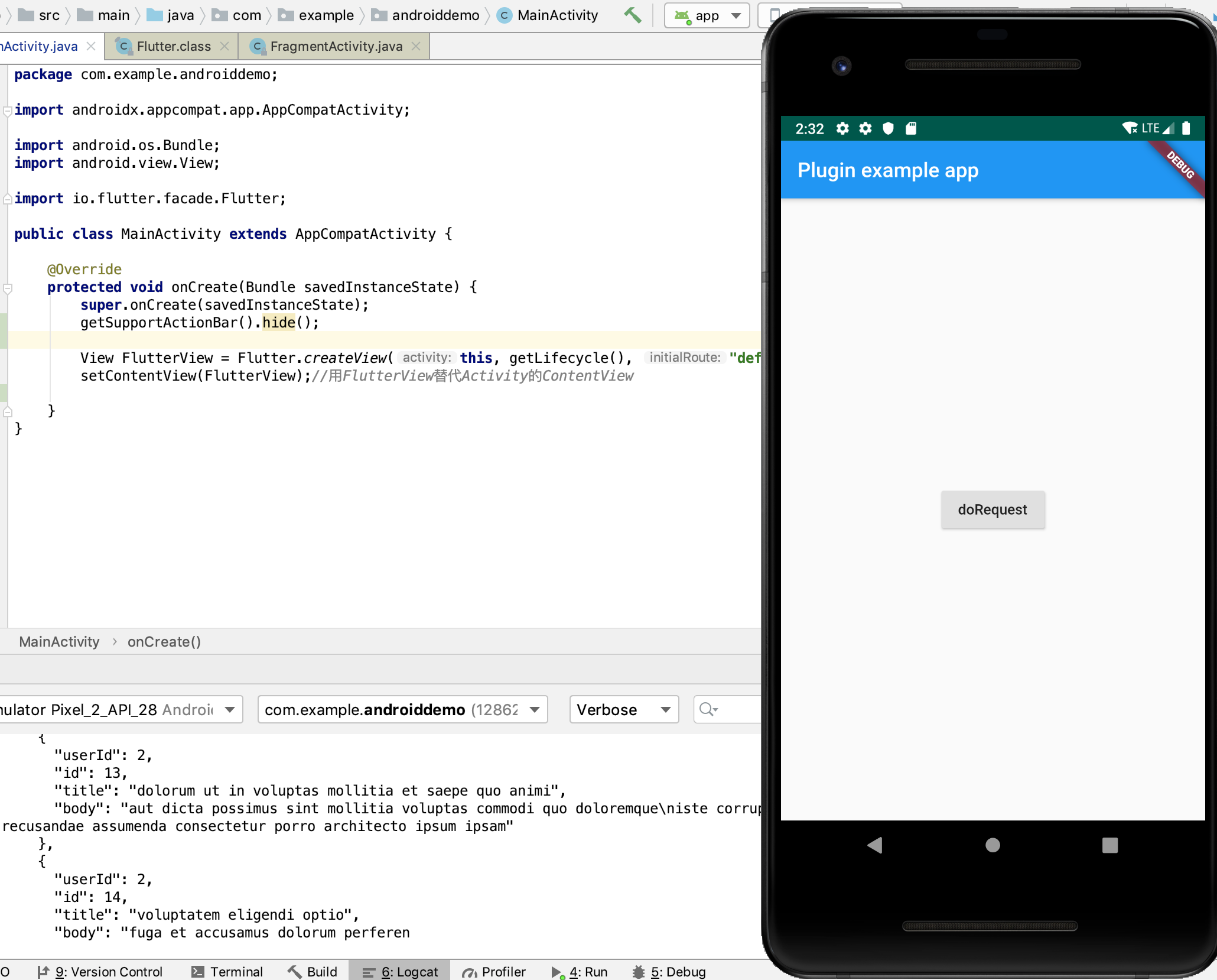在Android Studio中运行这段代码,并点击doRequest按钮,可以看到,我们可以在原生Android工程中正常使用Flutter封装的页面组件了。