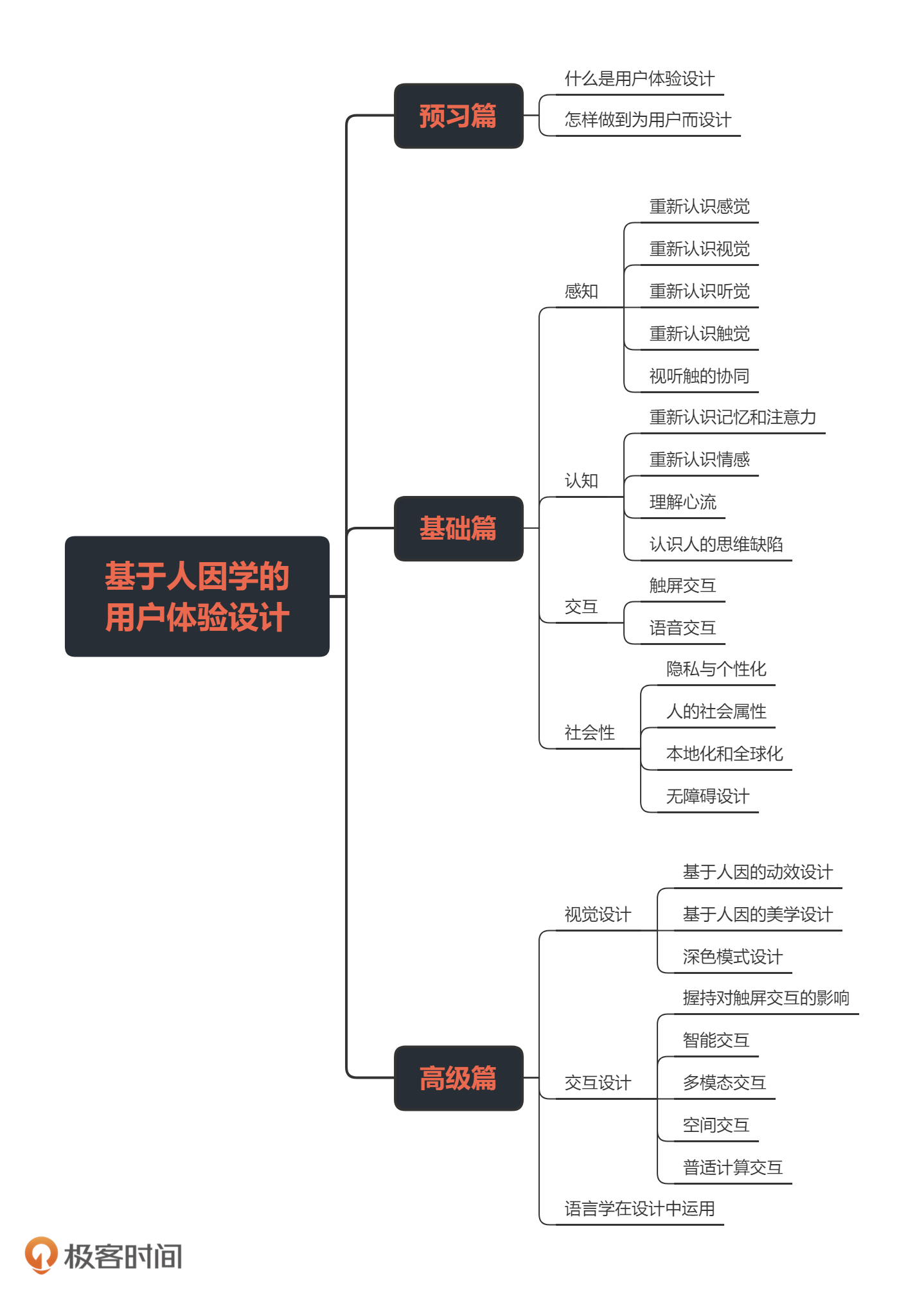 在基础篇部分,我会从人的感知觉入手,从视觉、听觉、触觉出发,再到人的大脑对信息的处理,再到人的交互反馈:手势、语音交互等。我们也会从人的个体谈到人的社会性,谈到无障碍的人因学知识。