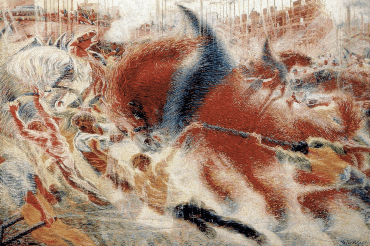 那个时候,基于时间和空间关系的相对论讨论风风火火。能从一个时间点延展到连续时间段在一个作品上的表达,这正是未来主义画家对相对论物理学的致敬。比如这幅《城市的崛起》。