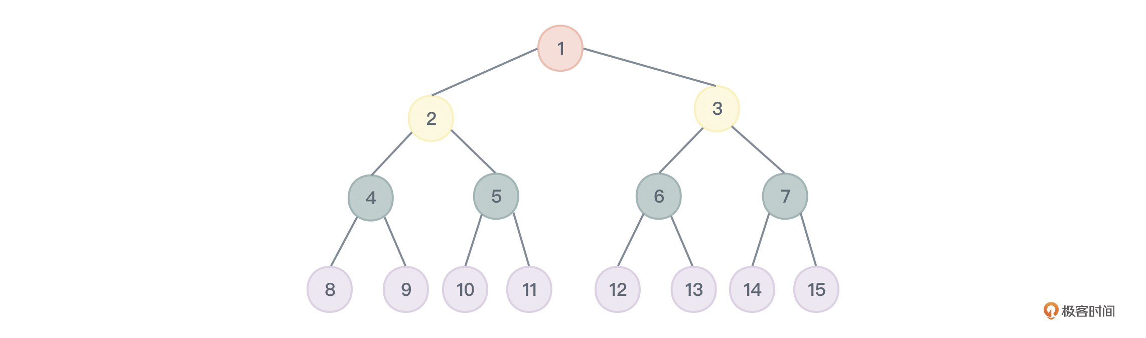 最后,我们说一下编号的特点。按照图5的顺序给每个满二叉树的节点从上到下从左到右进行编号,比如图中的1-15,不难发现,编号为i的分支节点,它的左孩子的编号为2i,右孩子的编号为2i+1。如果节点i存在父节点,则其父节点的编号是i/2的结果,如果没整除,那么去掉小数部分即可。