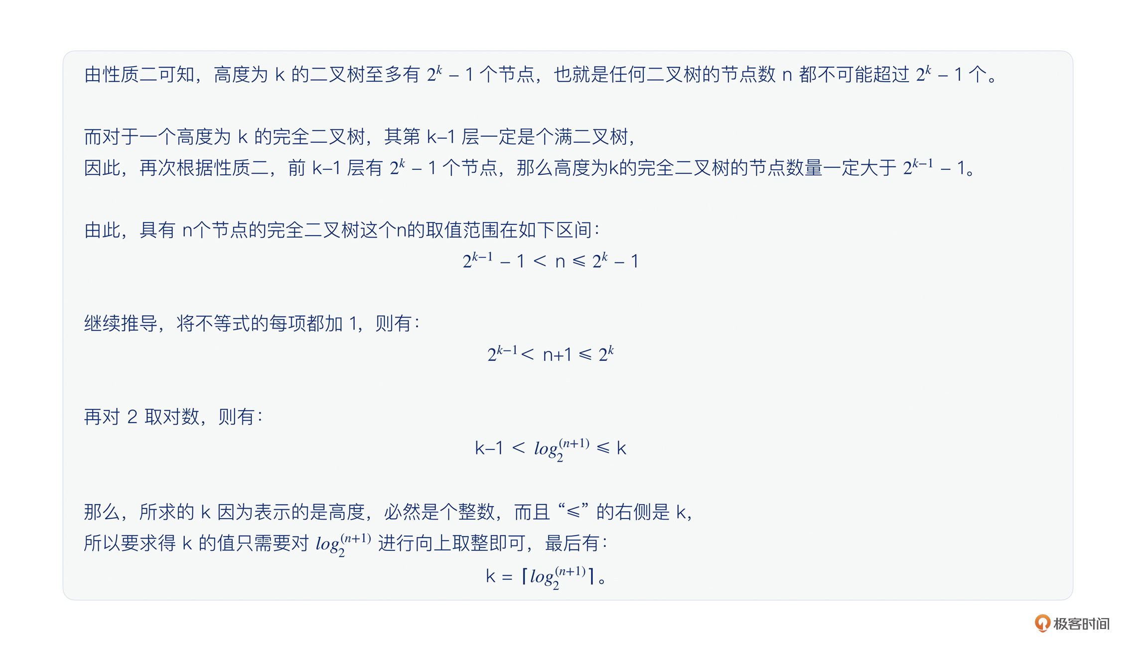 所以,不妨扩展一下性质五:一个完全二叉树的第k的节点的高度为⌈$log_{2}^{(k+1)}$⌉ 或者 ⌊$log_{2}^{k}$⌋ +1。