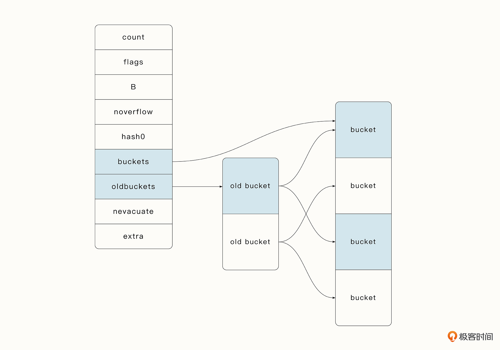 不过,如果溢出桶的数量过多,或者Map 超过了负载因子大小,Map 就要进行重建。负载因子是哈希表中的经典概念: