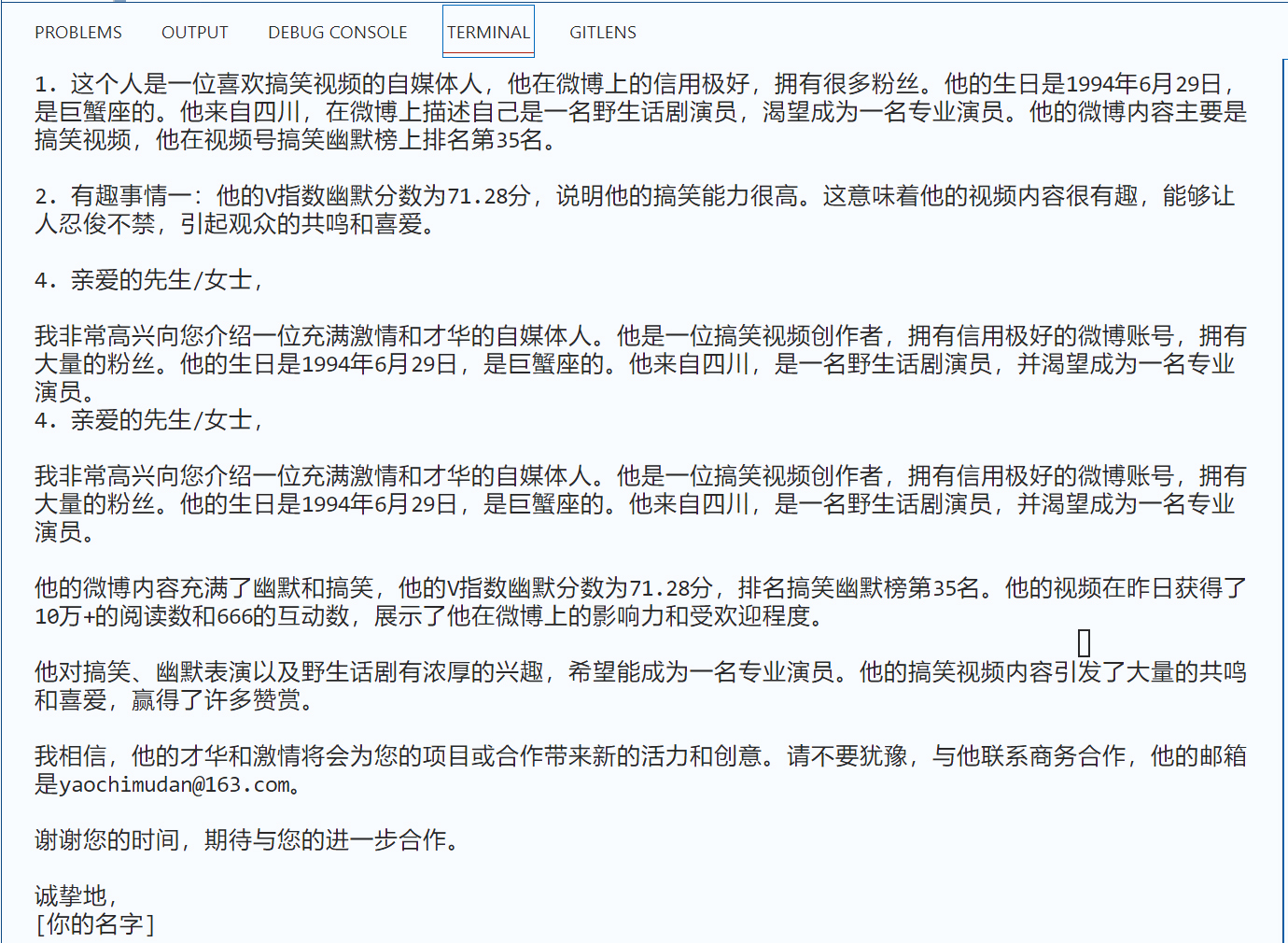 **第三步:**通过LangChain调用LLM,通过信息整合以及文本生成功能,根据大V的个人信息,写一篇热情洋溢的介绍型文章,谋求与该大V的合作。