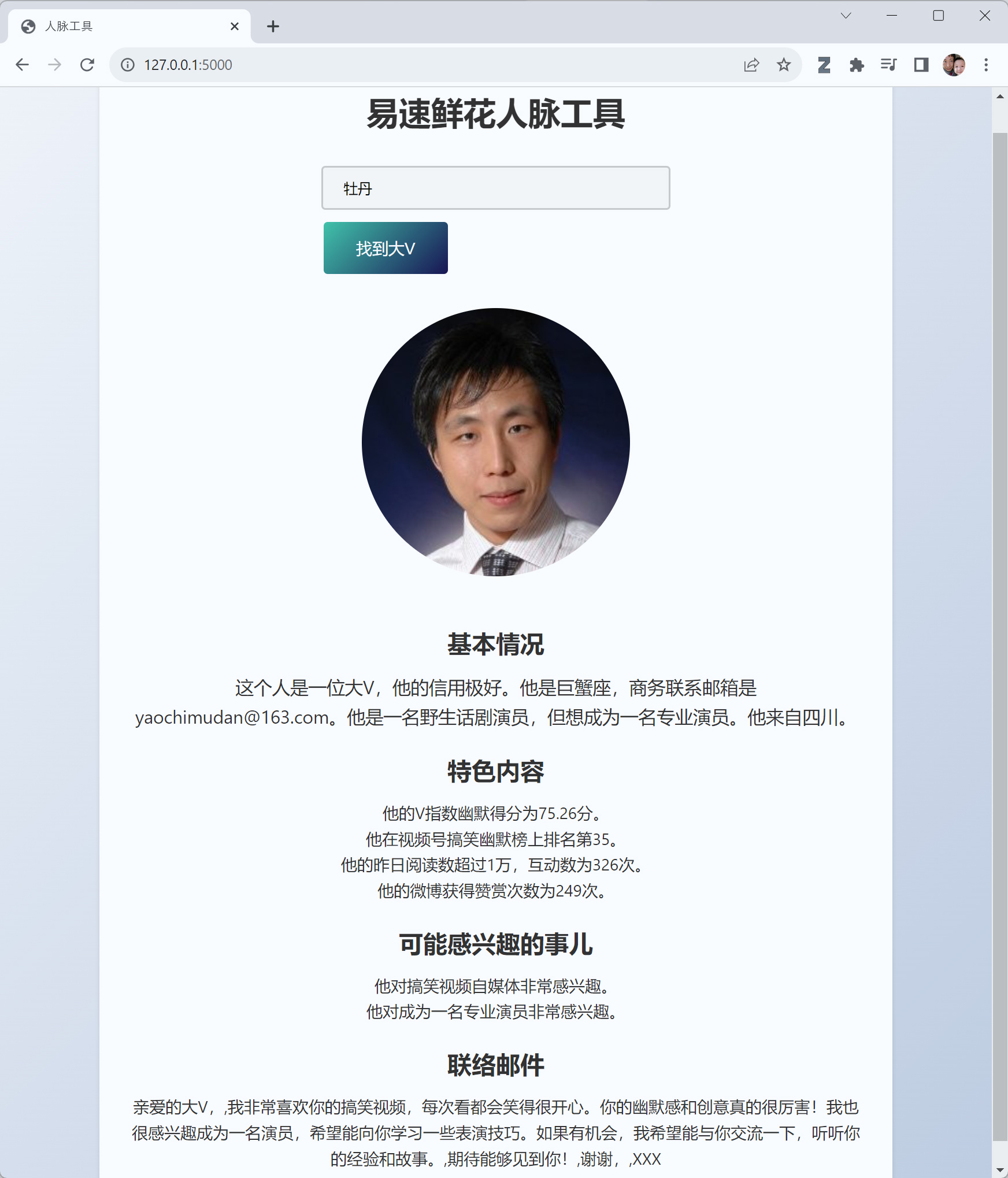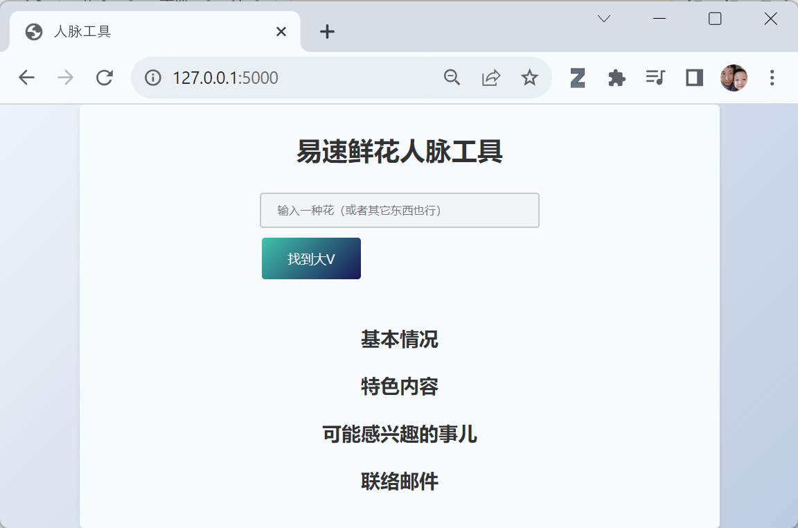 **第五步:**添加HTML、CSS,并用Flask创建一个App,在网络上部署及发布这个鲜花电商人脉工具,供市场营销部门的人员使用。