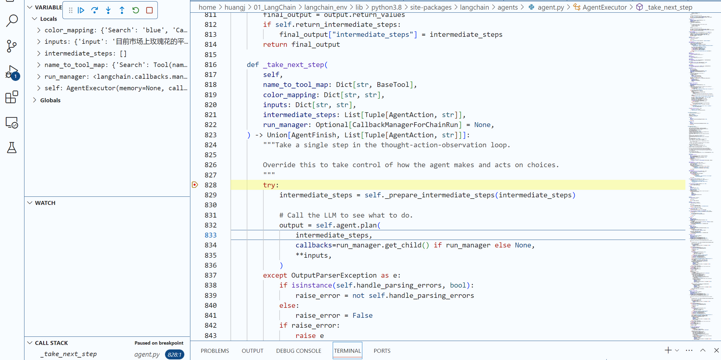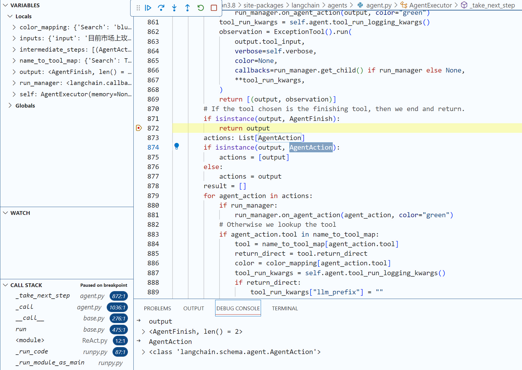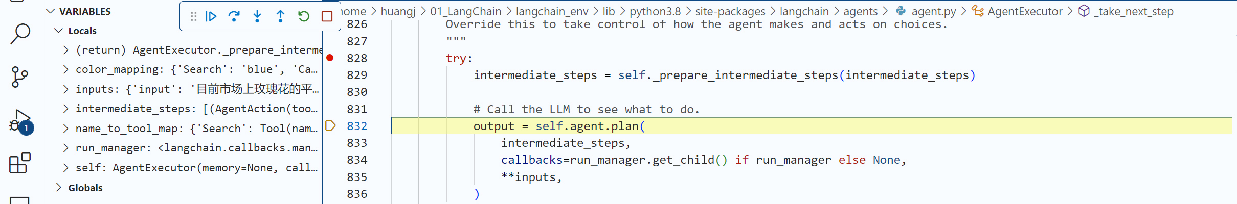 现在,请你用你的代码编辑工具(比如VS Code)在agent.run这个语句设置一个断点,用 “Step Into” 功能深入几层LangChain内部代码,直到我们进入了 agent.py文件的AgentExecutor类的内部方法 _take_next_step。