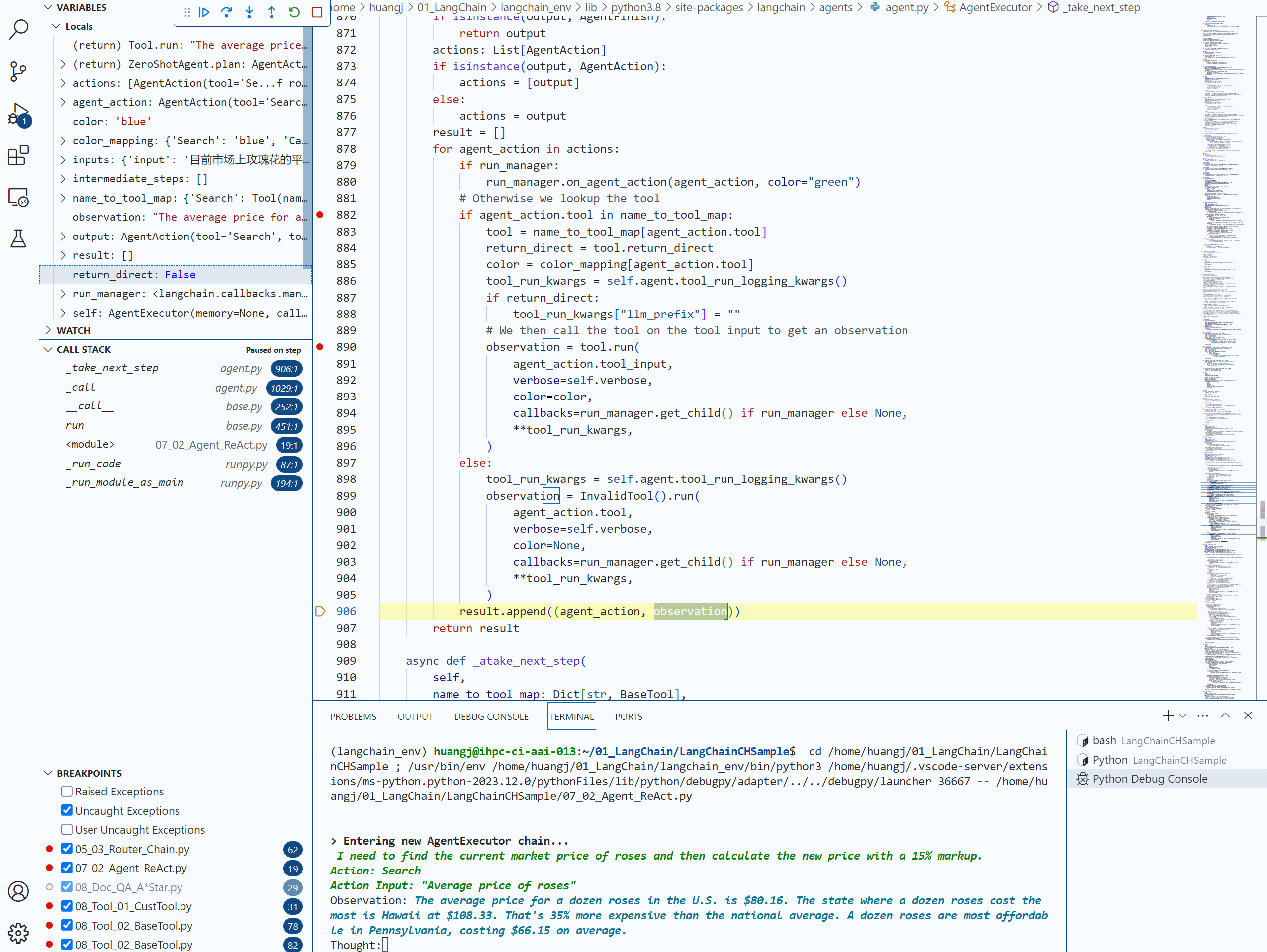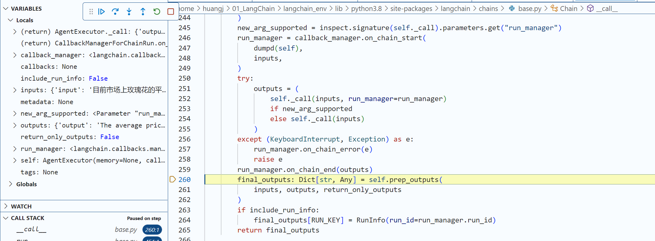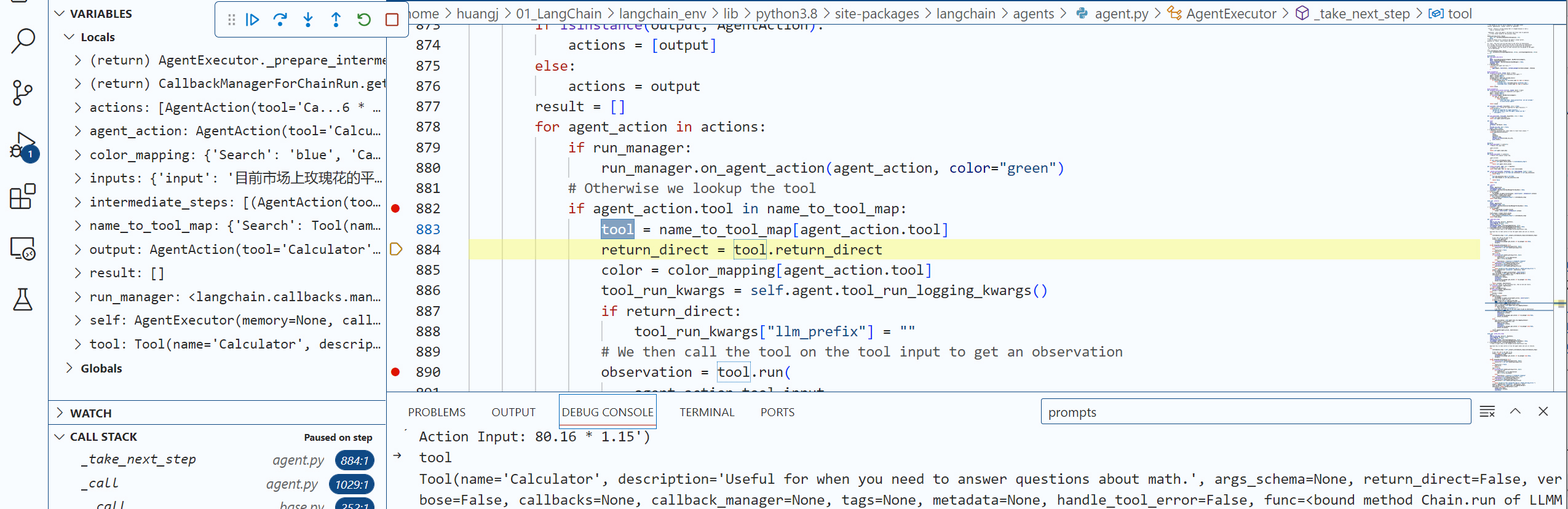 现在,请你用你的代码编辑工具(比如VS Code)在agent.run这个语句设置一个断点,用 “Step Into” 功能深入几层LangChain内部代码,直到我们进入了 agent.py文件的AgentExecutor类的内部方法 _take_next_step。