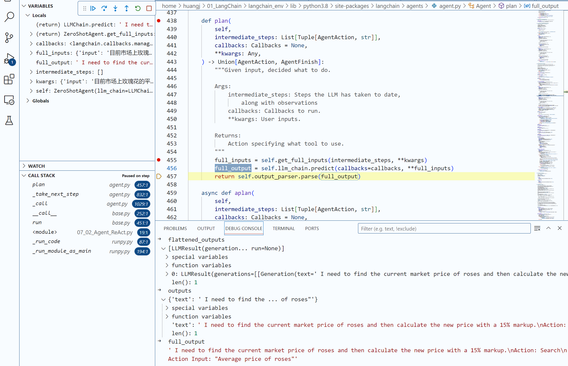 在AgentExecutor 的_take_next_step 方法的驱动下,我们进一步Debug,深入self.agent.plan方法,来到了整个行为链条的第一步—— Plan,这个Plan的具体细节是由Agent类的Plan方法来完成的,你可以看到,输入的问题将会被传递给llm_chain,然后接收llm_chain调用大模型的返回结果。