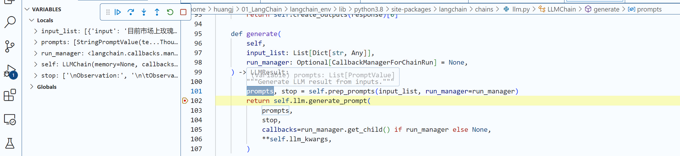 再往前进一步,我们就要开始调用大模型了,那么,LangChain到底传递给了大模型什么具体的提示信息,让大模型能够主动进行工具的选择呢?秘密在 LLMChain类的generate方法中,我们可以看到提示的具体内容。