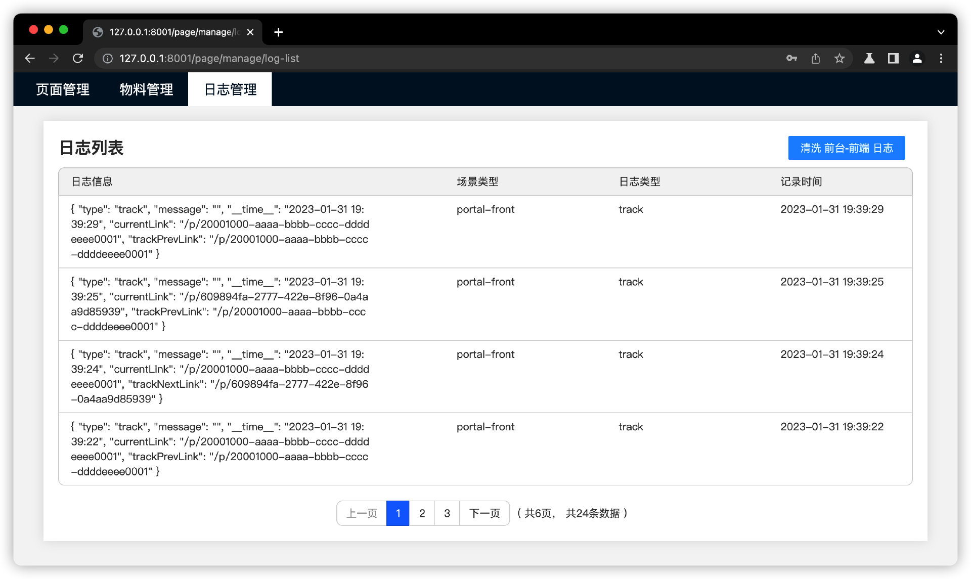 接着,在后台日志管理界面清洗日志,然后查询数据库的永久日志数据,看看近期页面有哪些前端页面报错日志。
