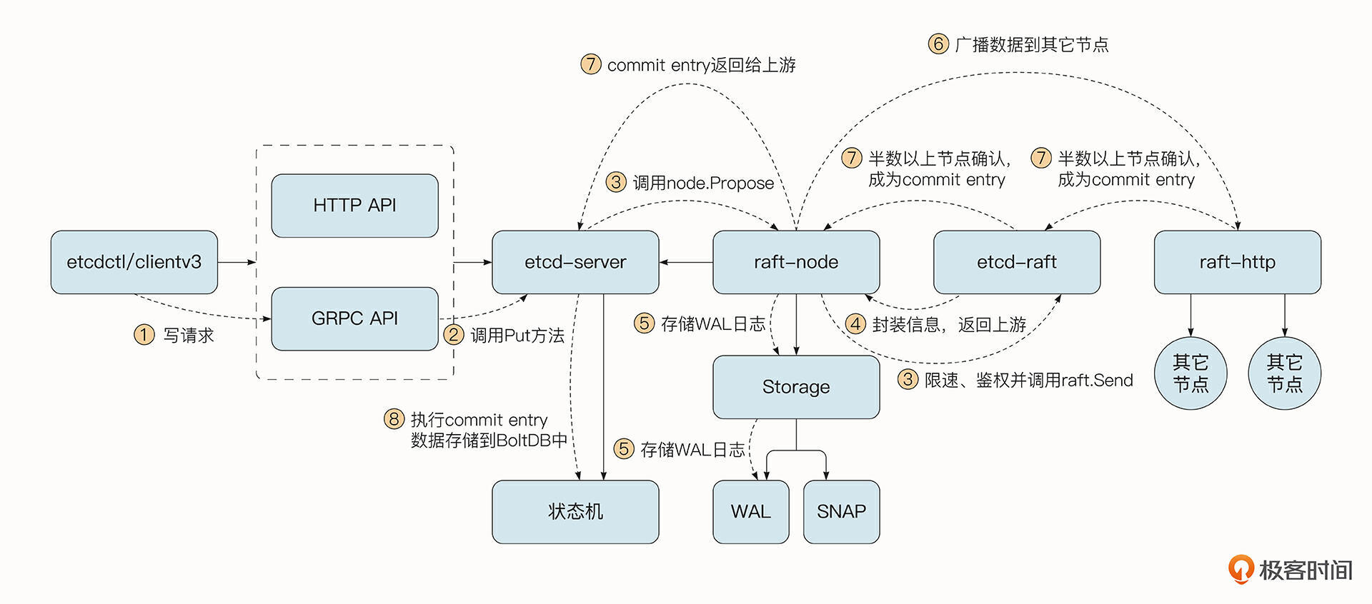 - 写操作会调用etcd Put方法,调用Put方法结束时并未真正地执行BoltDB的commit操作进行事务提交,如果这个时候节点崩溃了,如何保证数据不丢失呢?