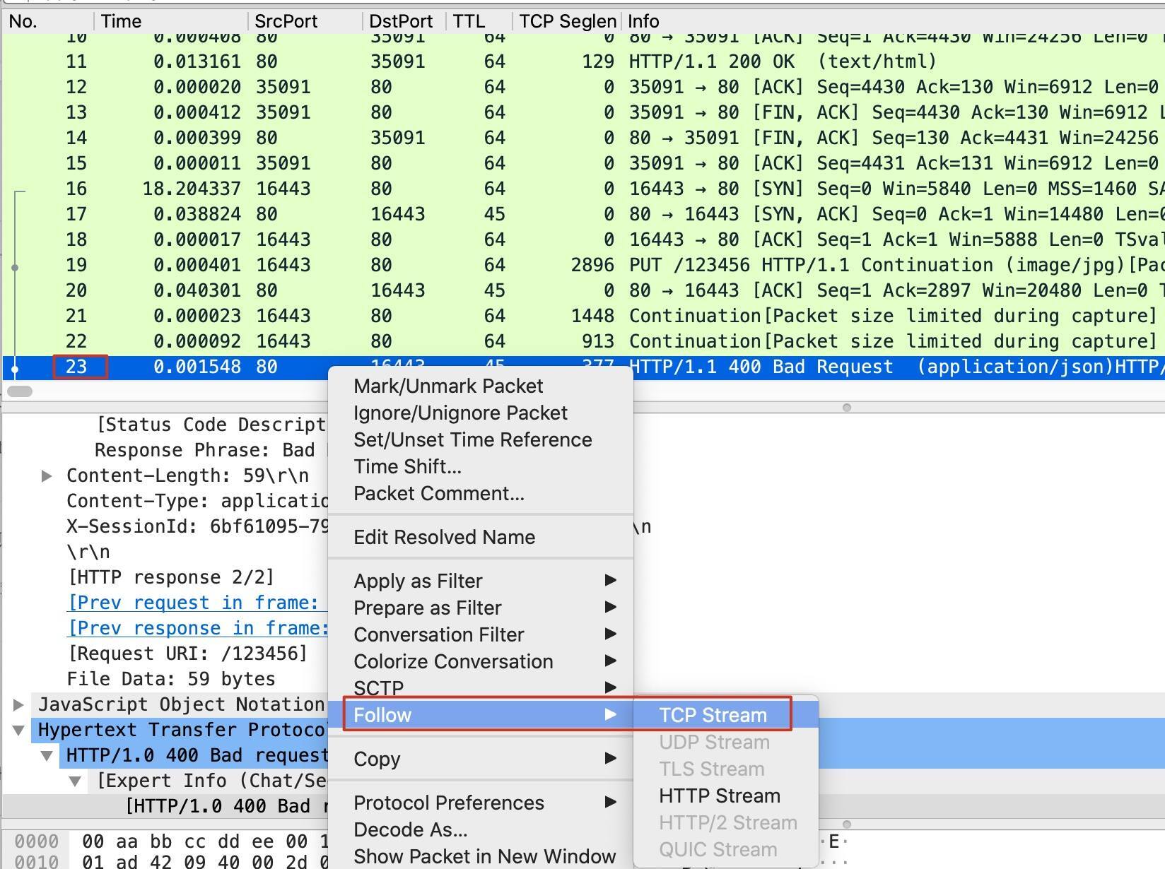 我们找一个请求,Follow TCP Stream来看一下详细情况。比如,我们选中23号报文,此时主界面也自动跳转到了这个报文的位置。我们选中它,右单击后选择Follow -> TCP Stream: